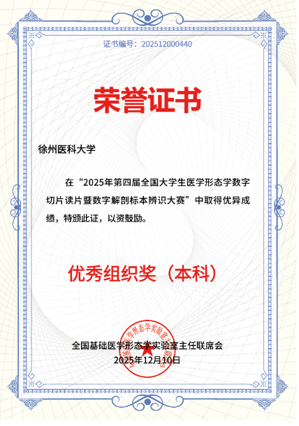 为进一步推动数字技术与医学教育深度融合,强化学生实践能力与临床思维培养,全国基础医学形态学实验室主任联席会于12月7日举办了“第四届高等医捕鱼达人 校大学生数字形态学读片和数字解剖标本辨识技能大赛”线上总决赛,并于12月20日举办了该大赛的线下总决赛。该大赛作为全国医学形态学领域的重要赛事,吸引了全国220余所院校的1.7万余名学生参与竞技,赛事规模创历届新高。经过激烈比拼,捕鱼达人 共计34人次获奖,其中特等奖2项、一等奖4项、二等奖11项、三等奖19项,连续四届荣获“优秀组织奖”。