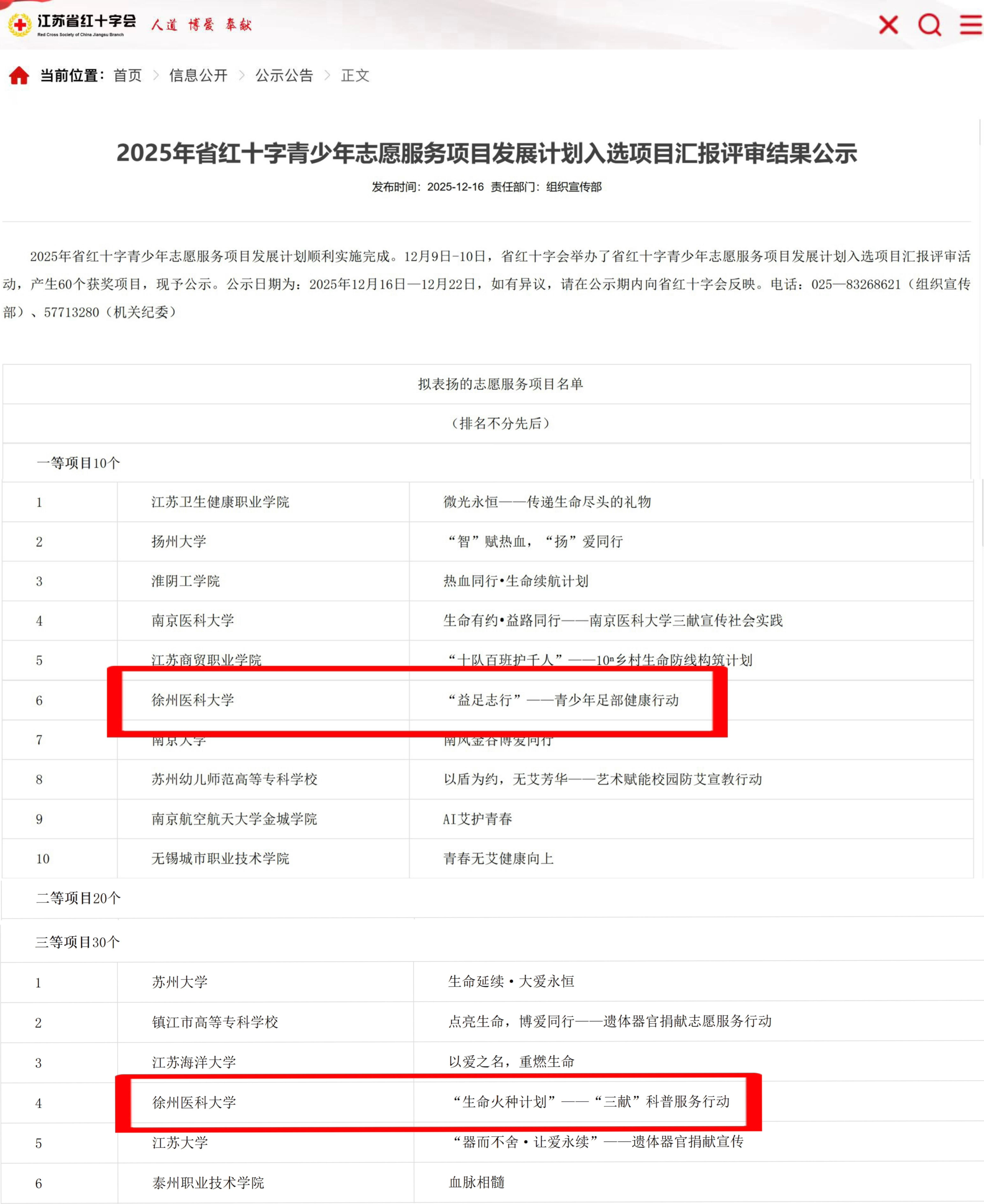 在江苏省红十字会组织下,2025年省红十字青少年志愿服务项目发展计划顺利实施完成,全省本专科院校共有80个项目入选,产生60个获奖项目,其中一等奖10项、二等奖20项、三等奖30项。经过激烈角逐,捕鱼达人 《“益足志行”——青少年足部健康行动》项目获评一等奖,《“生命火种计划”——“三献”科普服务行动》项目获评三等奖。