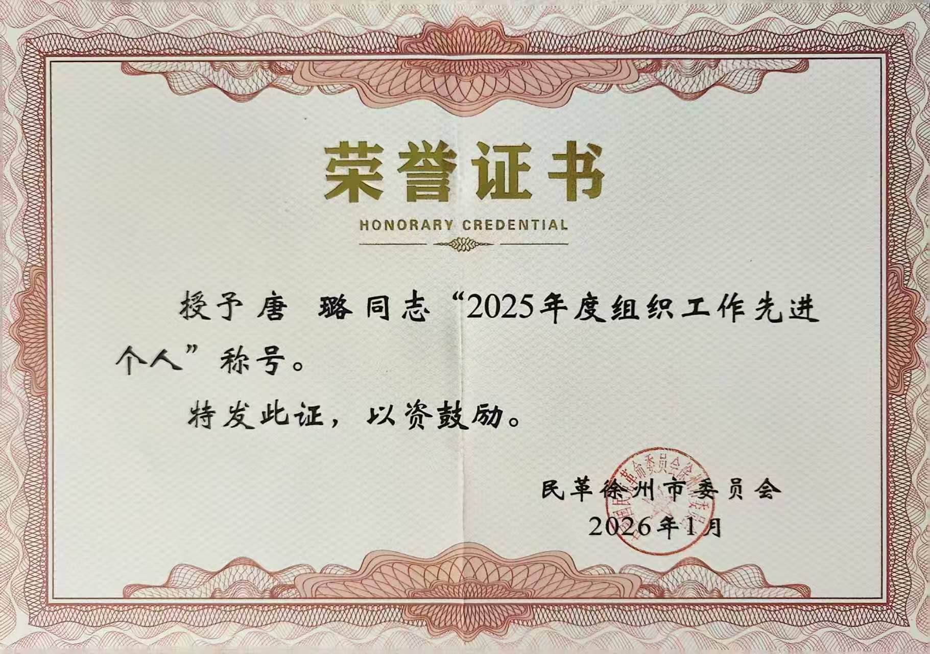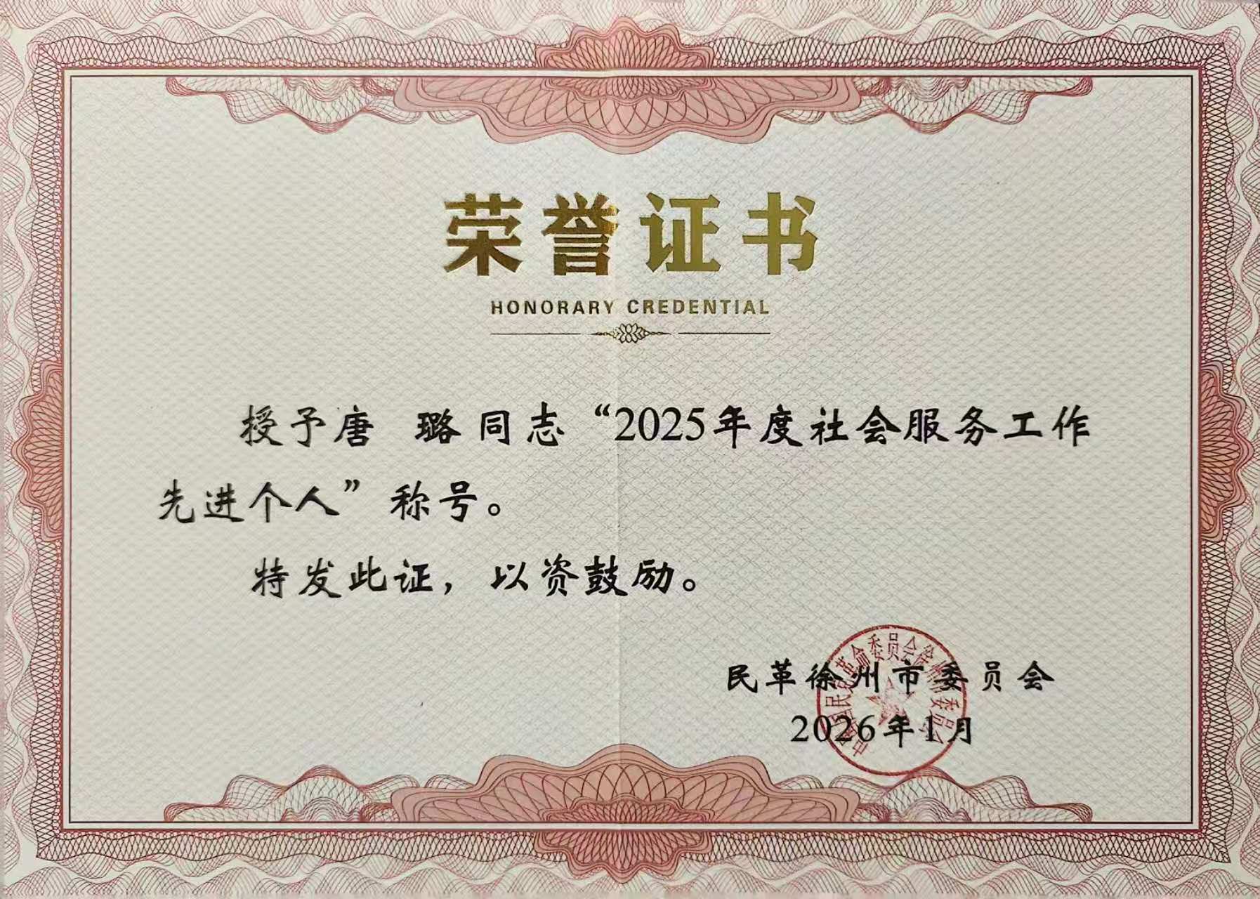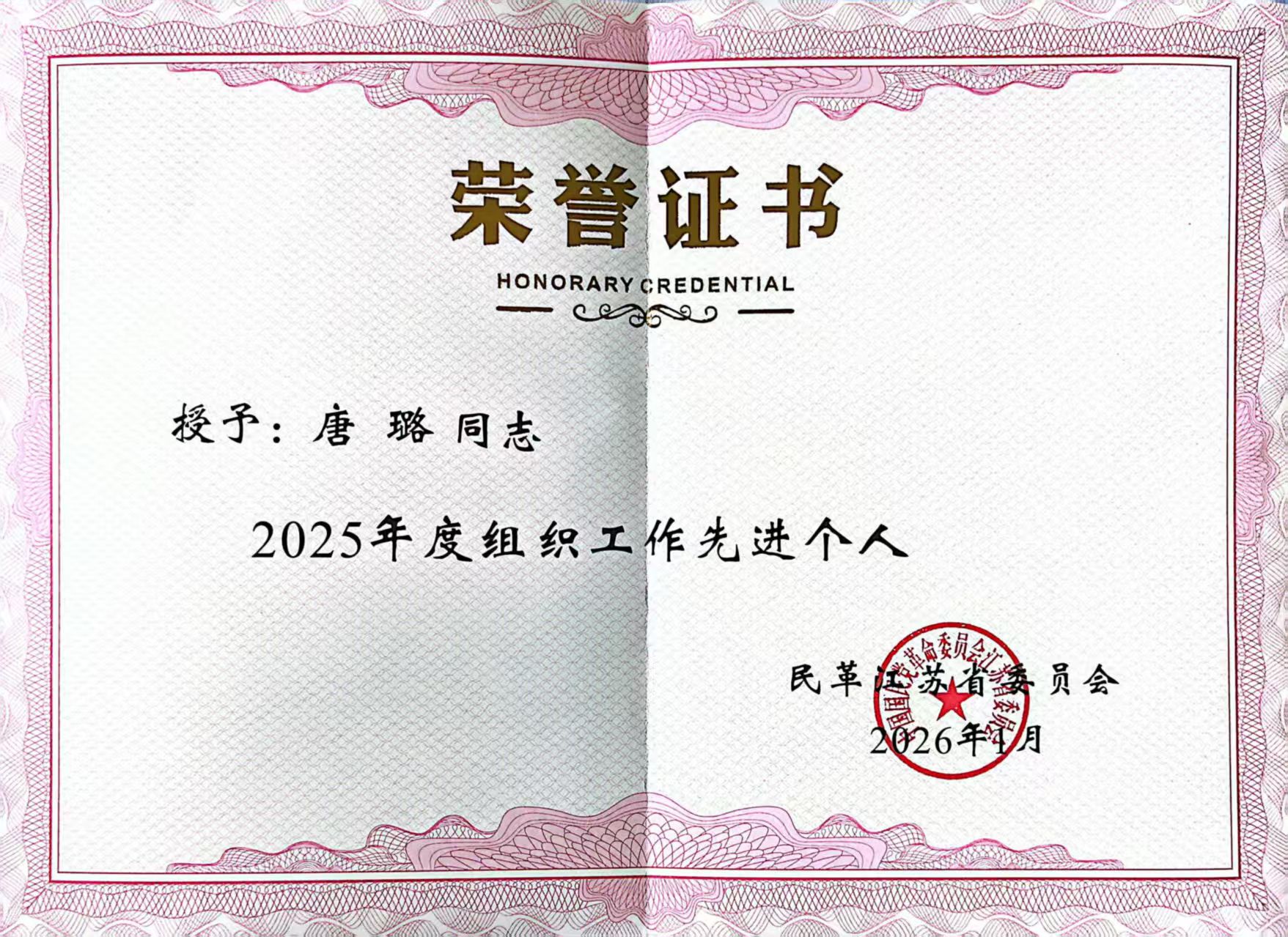 近日,捕鱼达人 民革支部主委、医学影像捕鱼达人 唐璐教授凭借在民革组织工作中的突出表现与深耕育人一线的显著成效,荣获民革省委会“组织工作先进个人”称号,民革徐州市委会2025年度“社会服务工作先进个人”“组织工作先进个人”。