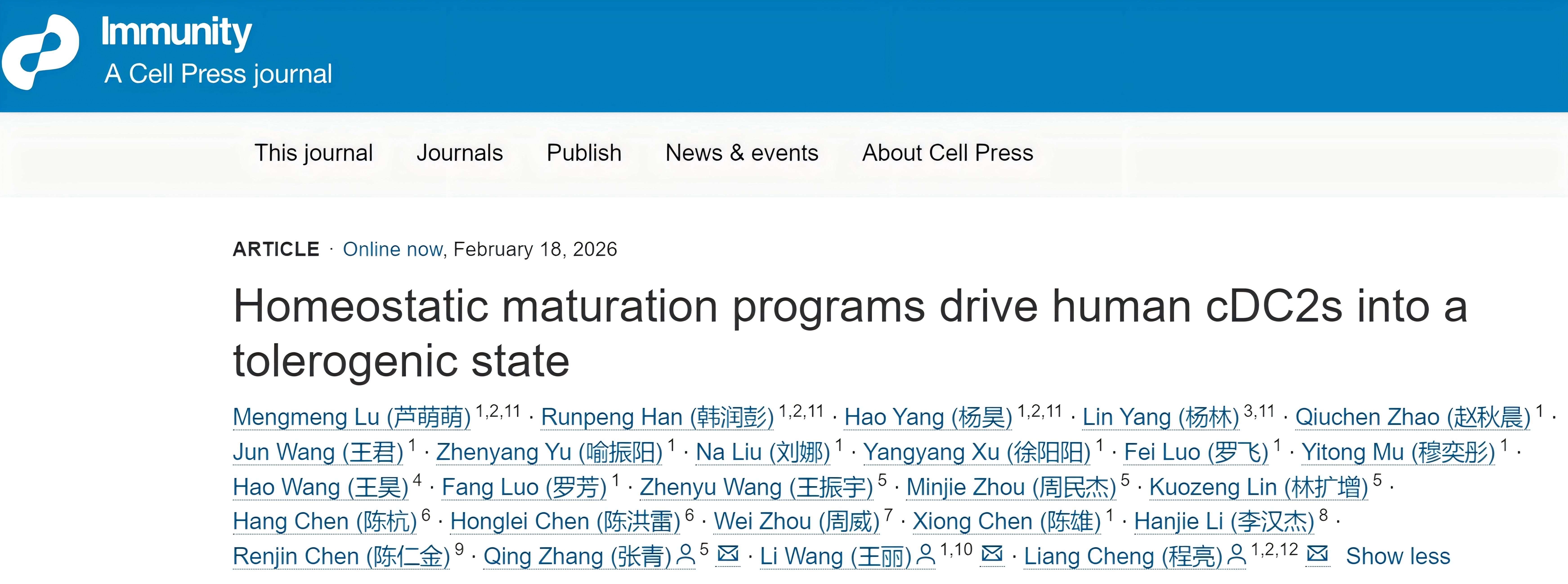2月18日,捕鱼达人 细胞治疗药物产业捕鱼达人 张青教授作为共同通讯作者,与武汉大学医学研究院程亮教授团队合作,在国际顶尖学术期刊《 Immunity》(医学类一区,TOP期刊,影响因子26.3)发表题为“Homeostatic maturation programs drive human cDC2s into a tolerogenic state”的研究论文。该研究首次发现并命名了人体内一群全新的稳态成熟树突状细胞——DC2hm(homeostatically matured cDC2),揭示DC2hm能够高效地诱导初始CD4+ T细胞分化为具有免疫抑制功能的调节性T细胞(Treg),从而主动抑制免疫系统攻击人体自身组织,起到了维持免疫耐受的“和平卫士”作用。这一发现不仅回答了“健康状态下人体DC细胞是否主动维持耐受”这一基础免疫学核心问题,也为自身免疫病的治疗开辟了全新的研究方向。
