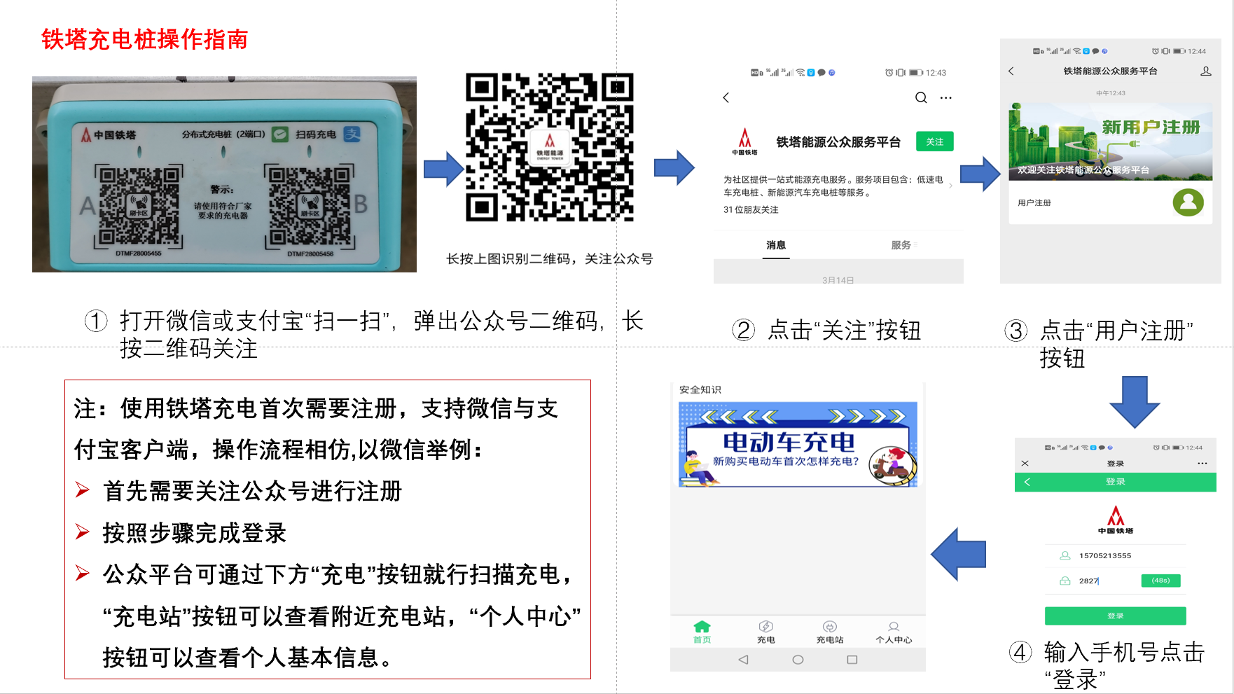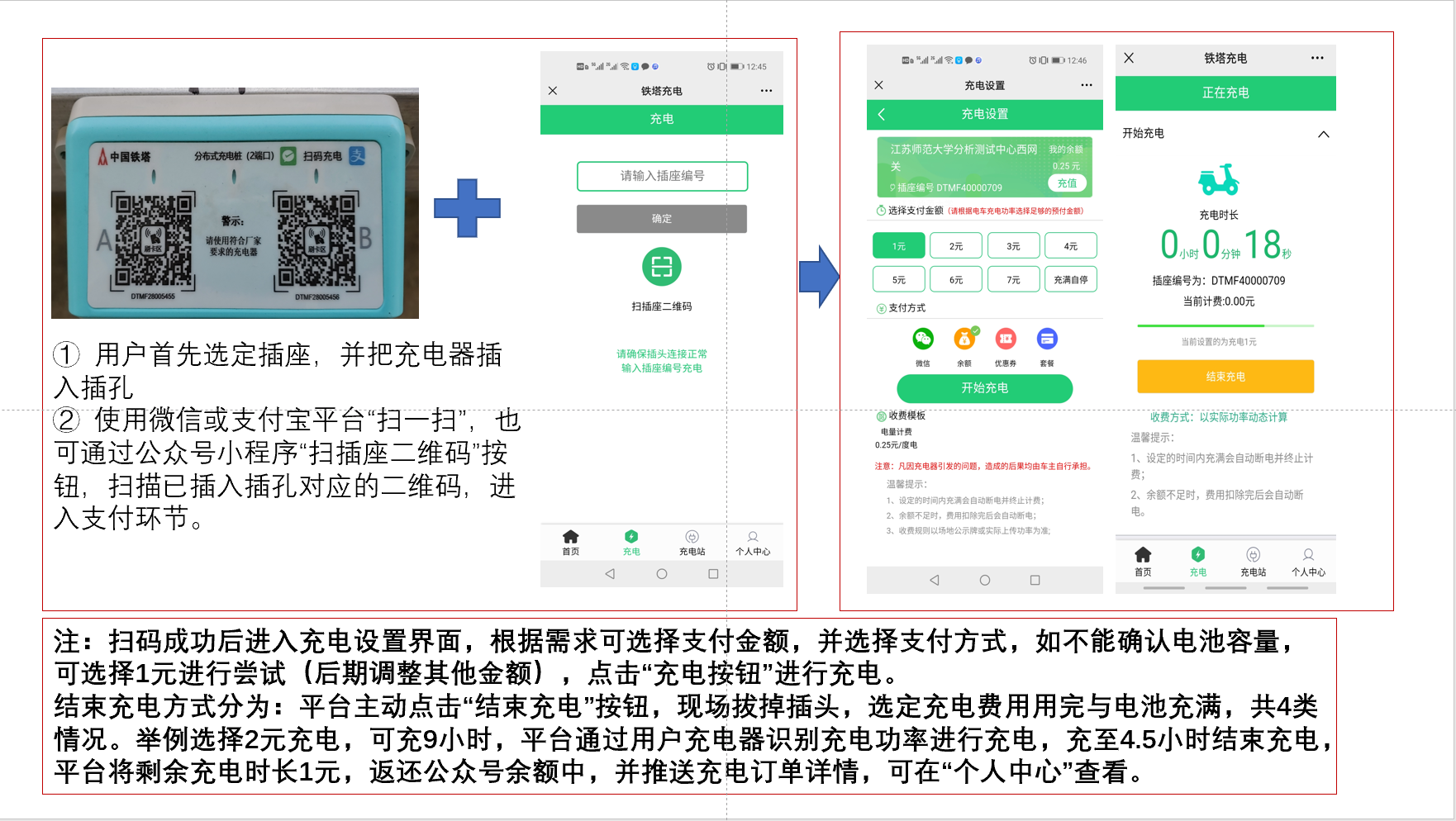 使用智能充电桩时请扫码或按照操作指南进行,为方便无手机支付功能的师生员工使用,可以免费领取智能刷卡模块,领取智能刷卡模块或咨询充电桩使用可以与管理员联系(张家林:18936363326、彭聪:18552477065)。