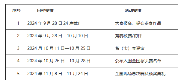 2024年整体赛事工作部署,赛程分为:校级初赛、省(市)赛评审及全国总决赛三个阶段。