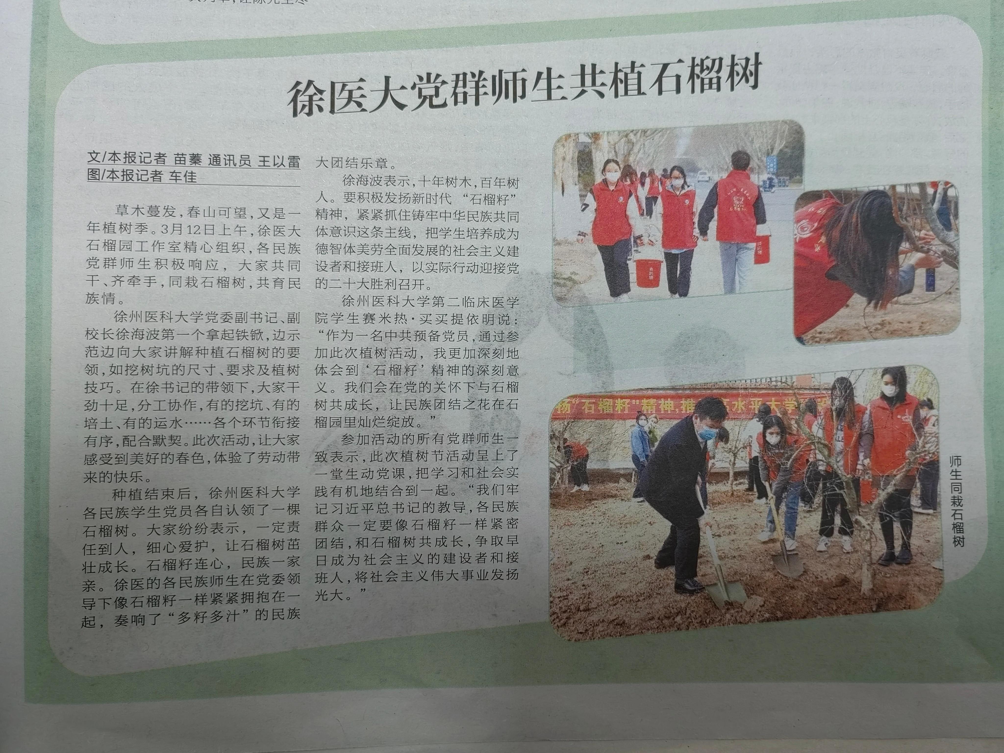 草木蔓发,春山可望,又是一年植树季。2022年3月12日上午,徐医大石榴园工作室精心组织,各民族党群师生积极响应,大家共同干、齐牵手,同栽石榴树,共育民族情。