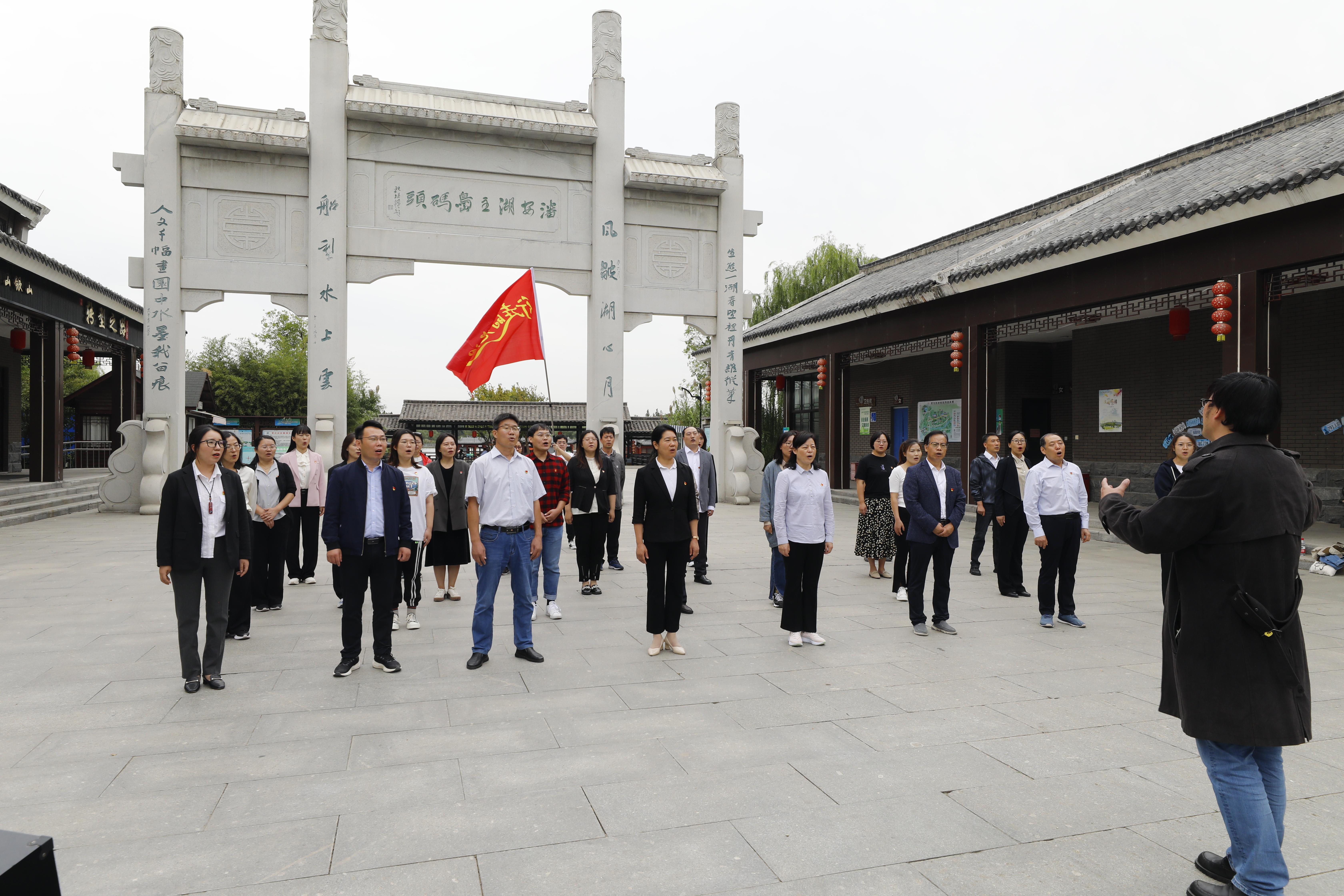 潘安湖畔,天高水阔、风景如画。通过生态修复再造,这个曾经荒芜的采煤塌陷区已成为湖阔景美、绿林成荫的潘安湖国家湿地公园。面对眼前如画美景,师生们激情澎湃,集体合唱《走进新时代》,把对祖国的无限热爱,融入到嘹亮的歌声中,深情讴歌党的伟大成就。