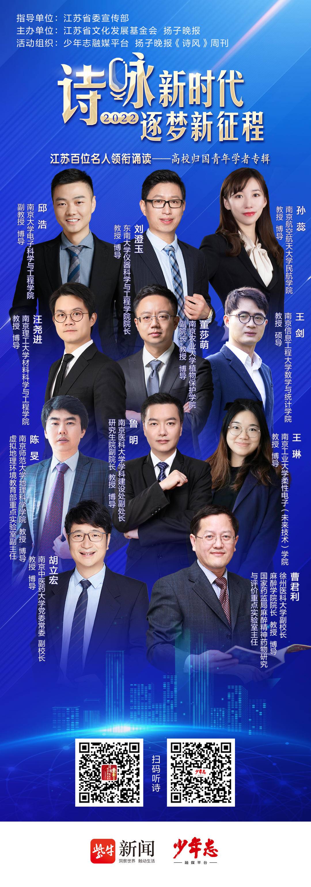 伟大时代呼唤人才,伟大事业造就人才。今天的中国,一个个学以报国的故事,为千帆竞发、百舸争流的时代写下生动注脚。2022“诗咏新时代 逐梦新征程”百位名人领衔诵读活动推出最新策划,来自江苏11所高校的归国留学青年学者,通过领诵诗歌的方式,礼赞新江苏、吟诵新时代。