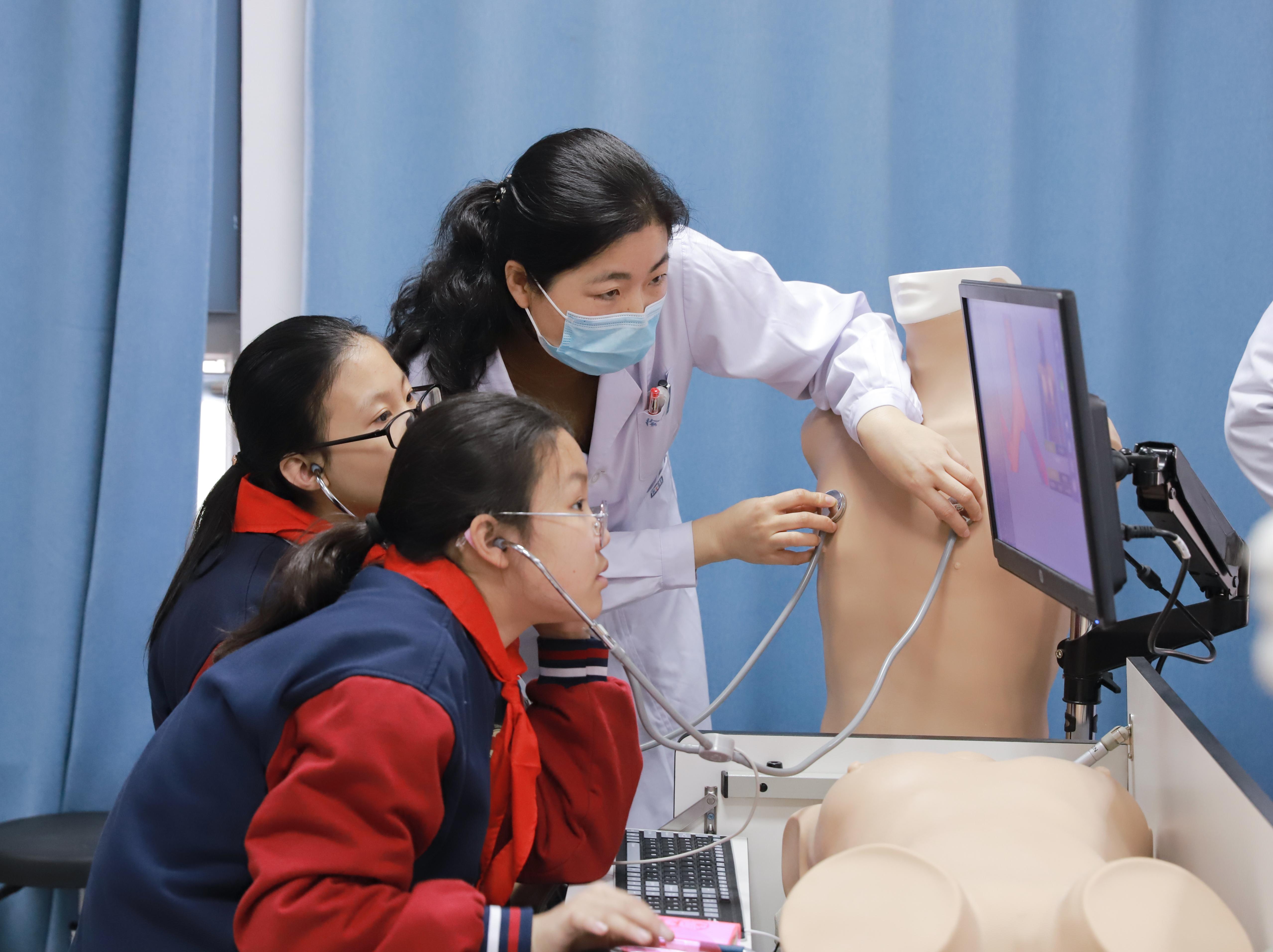 在活动中,孩子们步入生命科学展馆,用电子听诊器诊断分辨病情,用精密仪器体验手术操作,学习心肺复苏的抢救要领,一边听讲解、一边记录,时不时提出问题,钻研劲头十足。