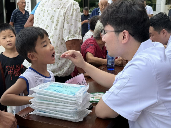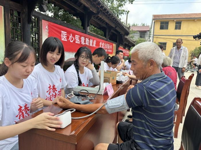 实践团医学生们为村民测量血压血糖,随行的专科医生们在医学生的辅助下为村民进行内科问诊与口腔科检查,分工明确,有条不紊,吸引了很多村民的到来,场面非常热烈。专家医生们和医学生们发挥专业所长,认真接待每一位前来问诊的群众,仔细询问村民病史、用药和治疗情况,用通俗易懂的语言给予耐心细致的解答,并提出具体诊疗建议,结合日常生活习惯讲解如何改善和预防,帮助群众养成健康科学的生活习惯,实践团成员们热情的态度和医生们专业的讲解得到了群众的一致好评。