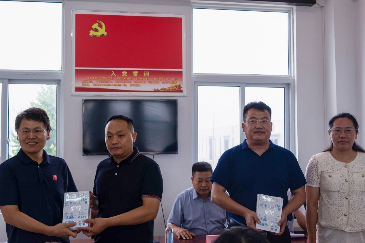 在碾庄镇岱山村党群服务中心,江苏省特聘教授、麻醉捕鱼达人 教工二支部书记丁海雷与江苏省特聘教授、江苏省麻醉学重点实验室副主任肖诚教授,共同为岱山村及碾庄镇实验小学捐赠了《麻醉医生看生命》系列科普丛书,并揭牌建立了大学生社会实践基地和健康科普教育基地。