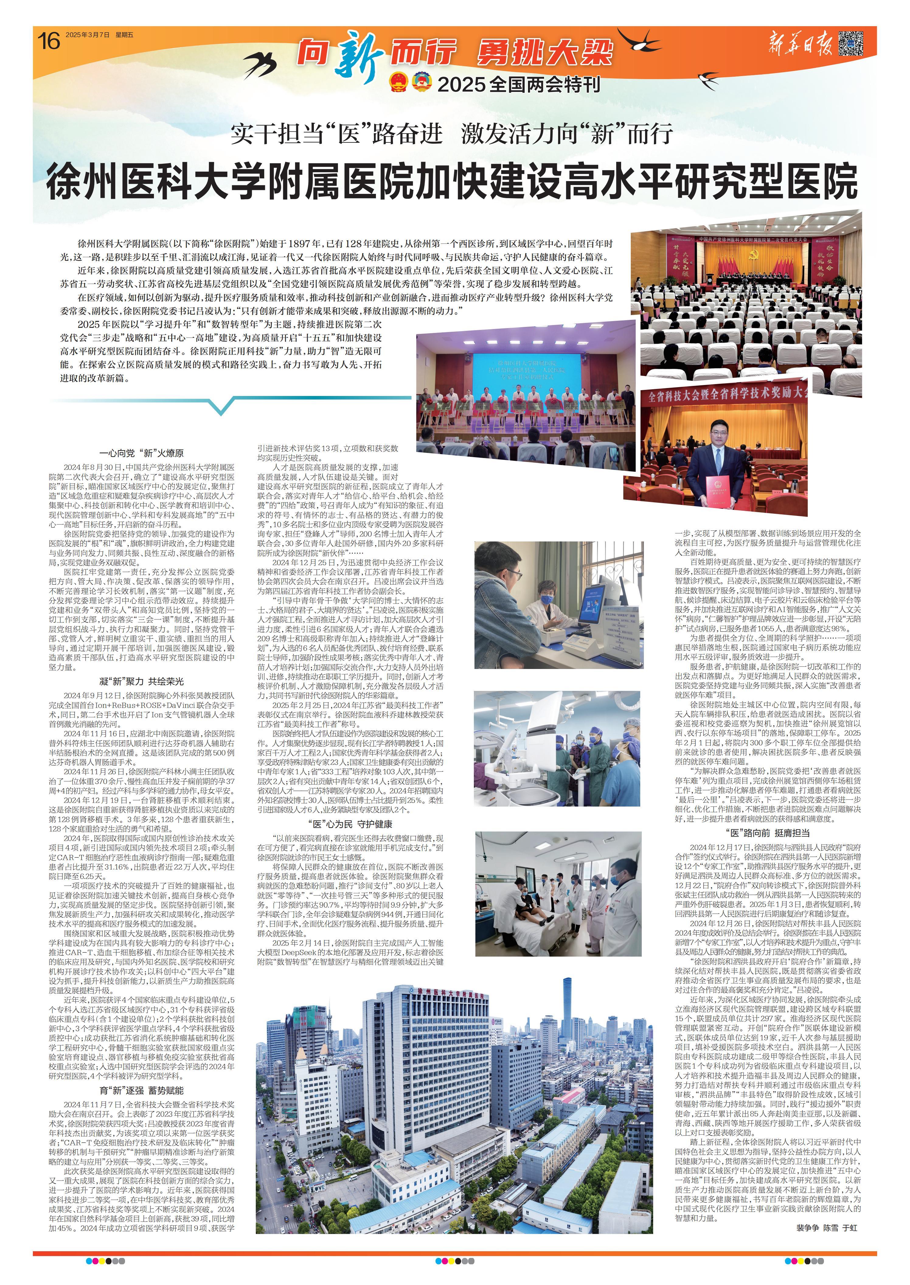 近年来,徐医附院以高质量党建引领高质量发展,入选江苏省首批高水平医院建设重点单位,先后荣获全国文明单位、人文爱心医院、江苏省五一劳动奖状、江苏省高校先进基层党组织以及“全国党建引领医院高质量发展优秀范例”等荣誉,实现了稳步发展和转型跨越。