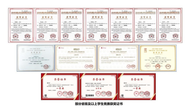外语部将学科竞赛作为检验教学成效、提升学生能力的重要平台,构建全赛事系统化培育体系,形成“人人参与、层层选拔、优中培优”的良好氛围,年均服务参赛学生超 2000人次。近5年,累计指导学生斩获省级及以上奖项100 余项:在“外研社・国才杯”全国短视频大赛中摘得银奖,实现跨文化传播能力新突破;“词达人”全国大学生英语词汇能力大赛连续三年表现亮眼;全国大学生英语竞赛特等奖数量稳居江苏省前列,在“理解当代中国”全国大学生外语能力大赛中也屡获佳绩。竞赛中的实战历练反哺课堂教学,推动教学质量与学生能力双向提升。