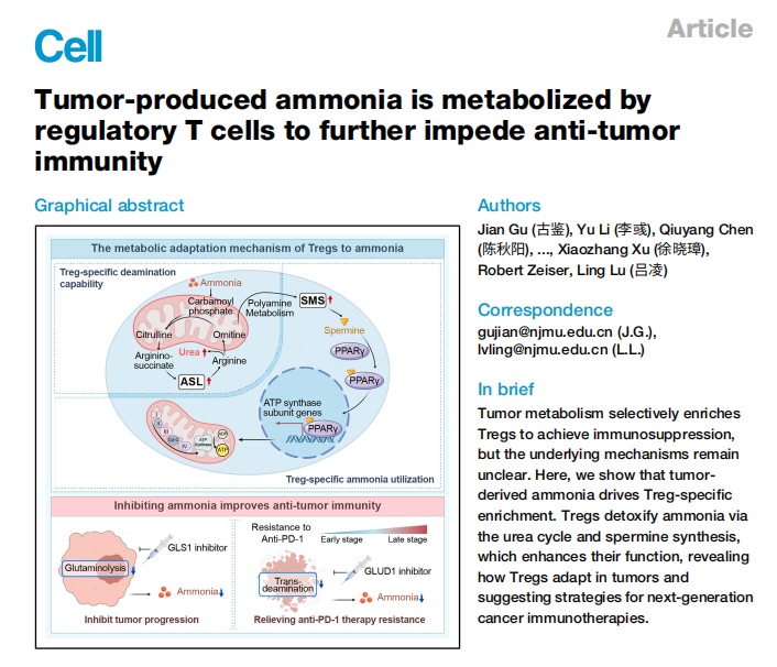 2025年12月24日,捕鱼达人 附属医院吕凌教授团队联合南京医科大学第一附属医院在国际顶级期刊《Cell》正式发表“调节性 T 细胞利用肿瘤来源氨增强免疫抑制功能并阻断抗肿瘤免疫”研究论文。该研究表明,肿瘤产生的氨会被调节性 T 细胞(Treg 细胞 )代谢,增强 Treg 细胞,从而进一步阻碍抗肿瘤免疫反应。该研究提示了将氨生成作为靶点能够抑制 Treg 细胞,从而为抗肿瘤免疫治疗提供了一种潜在新策略。这是捕鱼达人 、捕鱼达人 附属医院首次以第一完成单位在国际三大顶级学术杂志发表重大研究成果,实现了高水平论文重大突破。