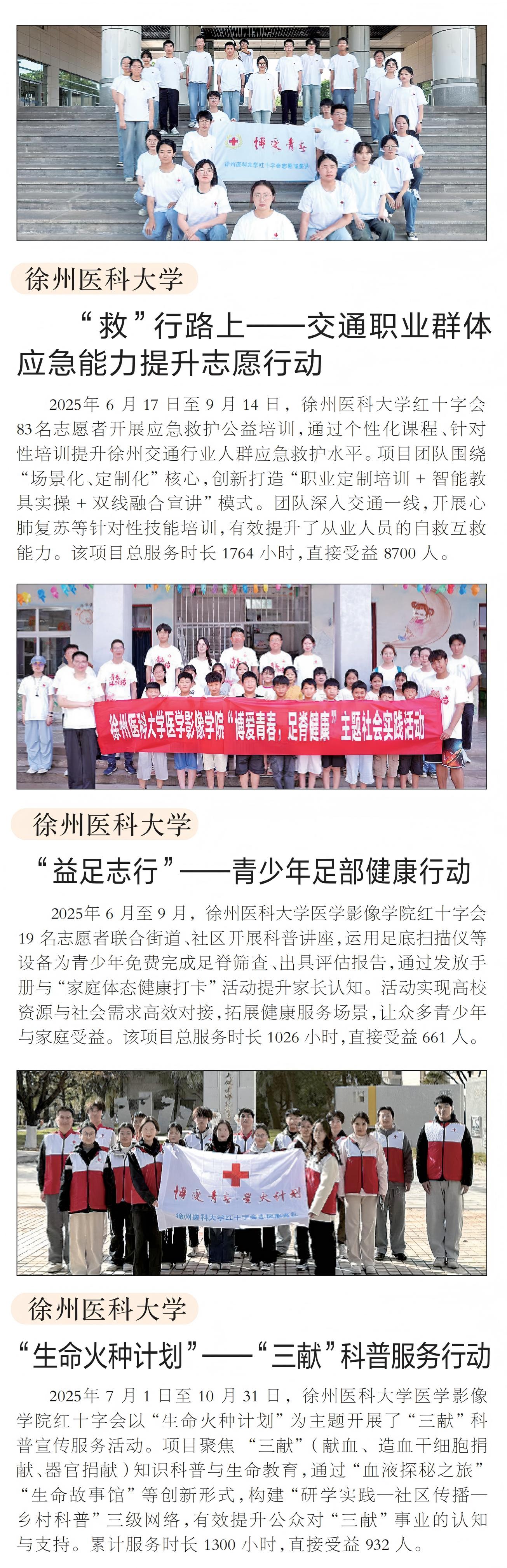 2025年,在徐州市红十字会的指导下,11所高校的旗帜在彭城大地上飘扬,580余颗年轻的心用13000多个小时的奉献,将“人道、博爱、奉献”的红十字精神,书写进近2.76万人次受益群众的记忆里。