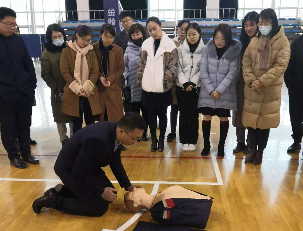 刘建海处长介绍了校园防火的相关知识,重点介绍了学生宿舍火灾成因和预防办法,讲解了干粉灭火器的使用方法并进行了现场操作;各位老师分组进行灭火演练,掌握了正确应对火灾的措施和技能。演练结束后,老师们参加了急救知识培训,徐医附院急救中心赵明阶老师向大家讲解了心肺复苏、AED应用等常用的急救知识和技能,以及如何抓住“黄金”时间进行急救,并现场演示和指导老师们演练心肺复苏等急救方法。
