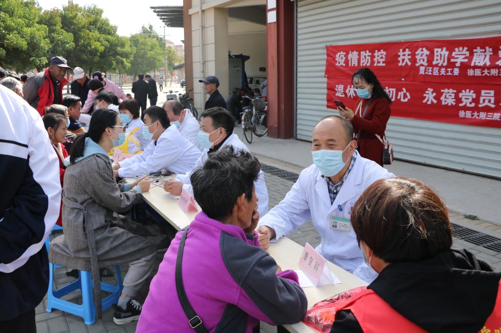 10月22日上午,校关工委常务副主任王勇、时继尧,徐医大附三院党委书记、关工委主任黄一虹,纪委书记、关工委副主任方锦花一行二十余人,在贾汪区关工委精心组织和大力支持下,在贾汪区老矿街道五号井社区展开迎“九九重阳节 关爱老人送健康”活动。徐医大附三院心内科主任朱永锋为社区老人作了“疫情防控小常识”和“高血压病的预防与养生”的讲座。随后,来自各科室的专家们为100多名老人在小区广场开展义诊,进行简单体检和免费咨询。老人们纷纷表示,免去了他们到医院检查的奔波劳累之苦,深深感受了温暖和关怀。