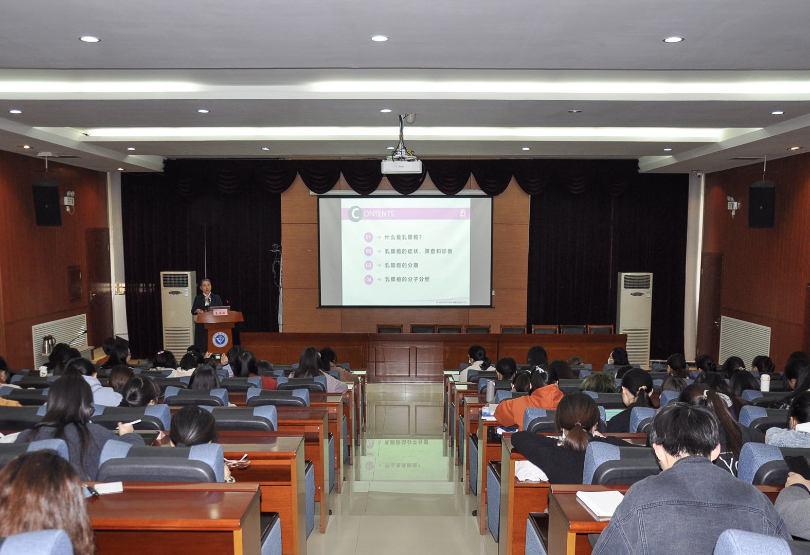 朱教授根据当前乳腺癌患病率在我国渐呈高发态势,已经跃升为恶性肿瘤的排名首位的现状,以典型事例开场,结合临床病例和长期临床工作的诊疗经验,向大家介绍了乳腺疾病的特点及癌变的诱发因素,并就乳腺癌临床症状、筛查和诊断方法及治疗方案作了深入浅出讲解。她在讲座中指出乳腺癌可防可治,对乳腺疾病要早发现、早诊断、早治疗,良好的心态和健康的生活理念可以降低乳腺癌发生风险。在最后的提问环节,朱教授详细解答了听众们的困惑。