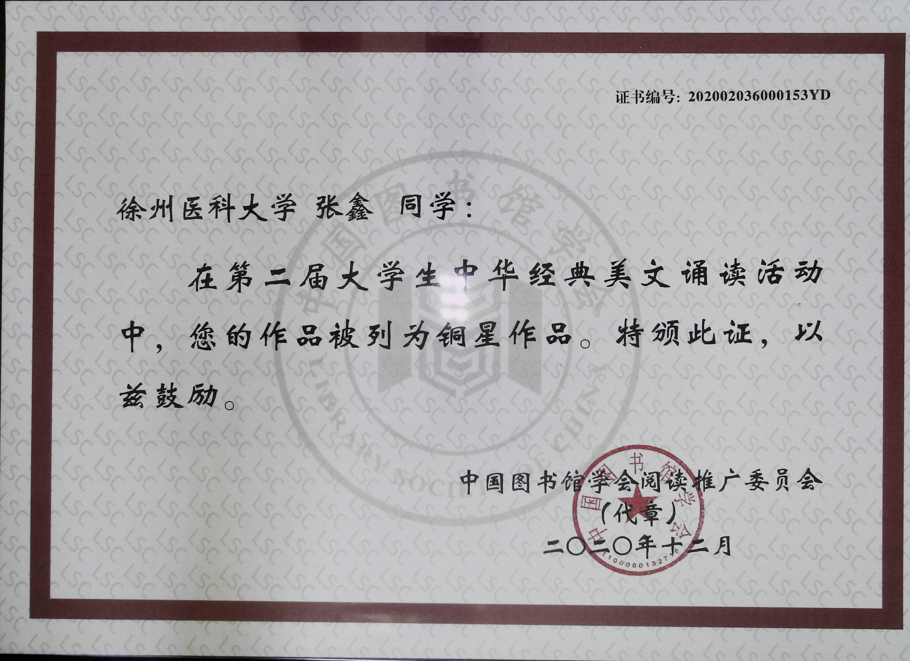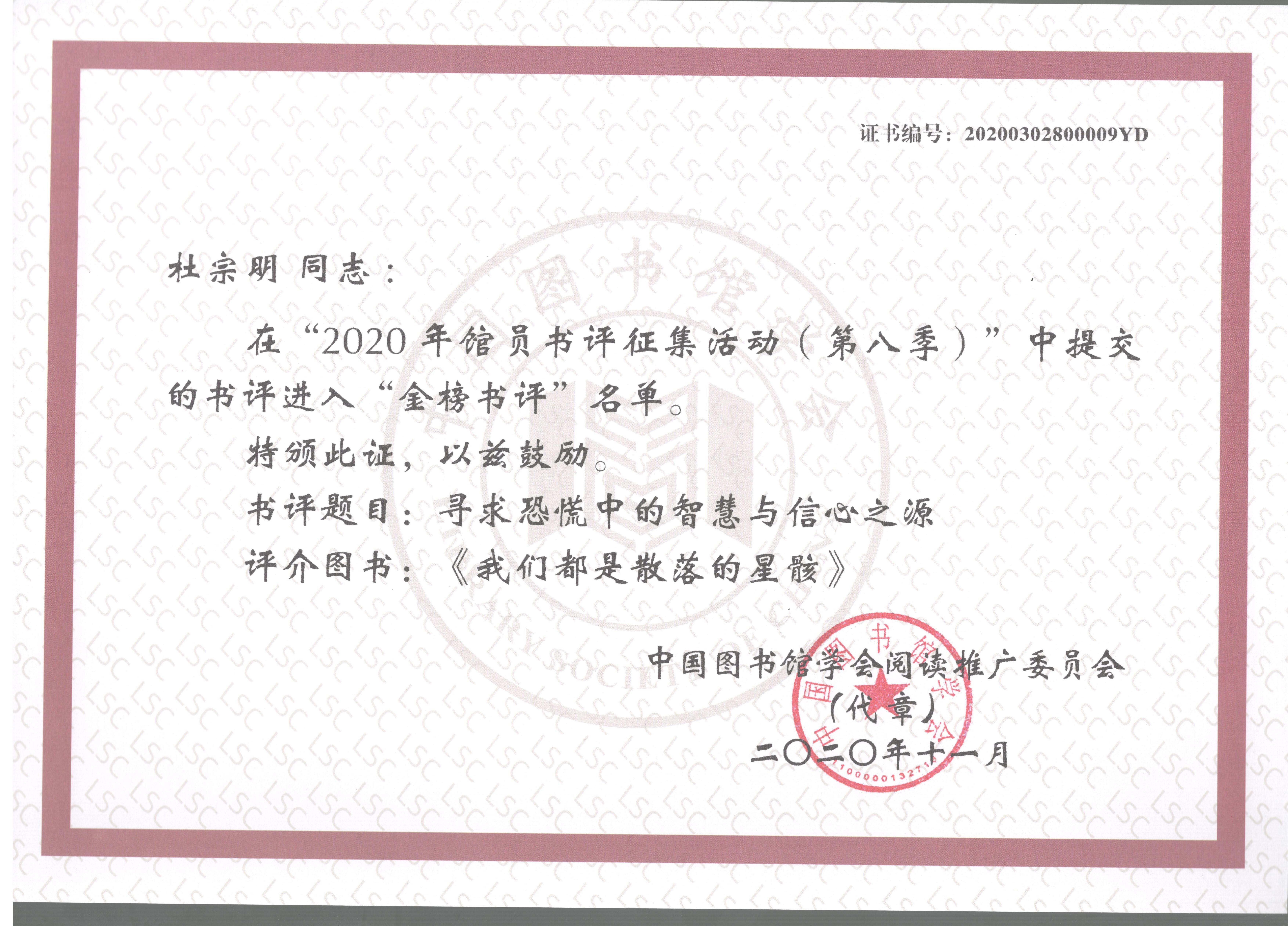 近日,由中国图书馆学会主办的多项阅读推广活动落下帷幕,捕鱼达人 图书馆首次组织参加了部分赛事。其中,由我馆馆员杜宗明基于评介图书《我们都是散落的星骸》所撰写的书评《寻求恐慌中的智慧与信心之源》,在“2020年馆员书评第八季征集活动”中荣膺金奖书评;我馆组织指导捕鱼达人 2018级本信息班张鑫读者推送的作品《秋夜》,在“第二届大学生中华经典美文诵读活动”中斩获铜奖。