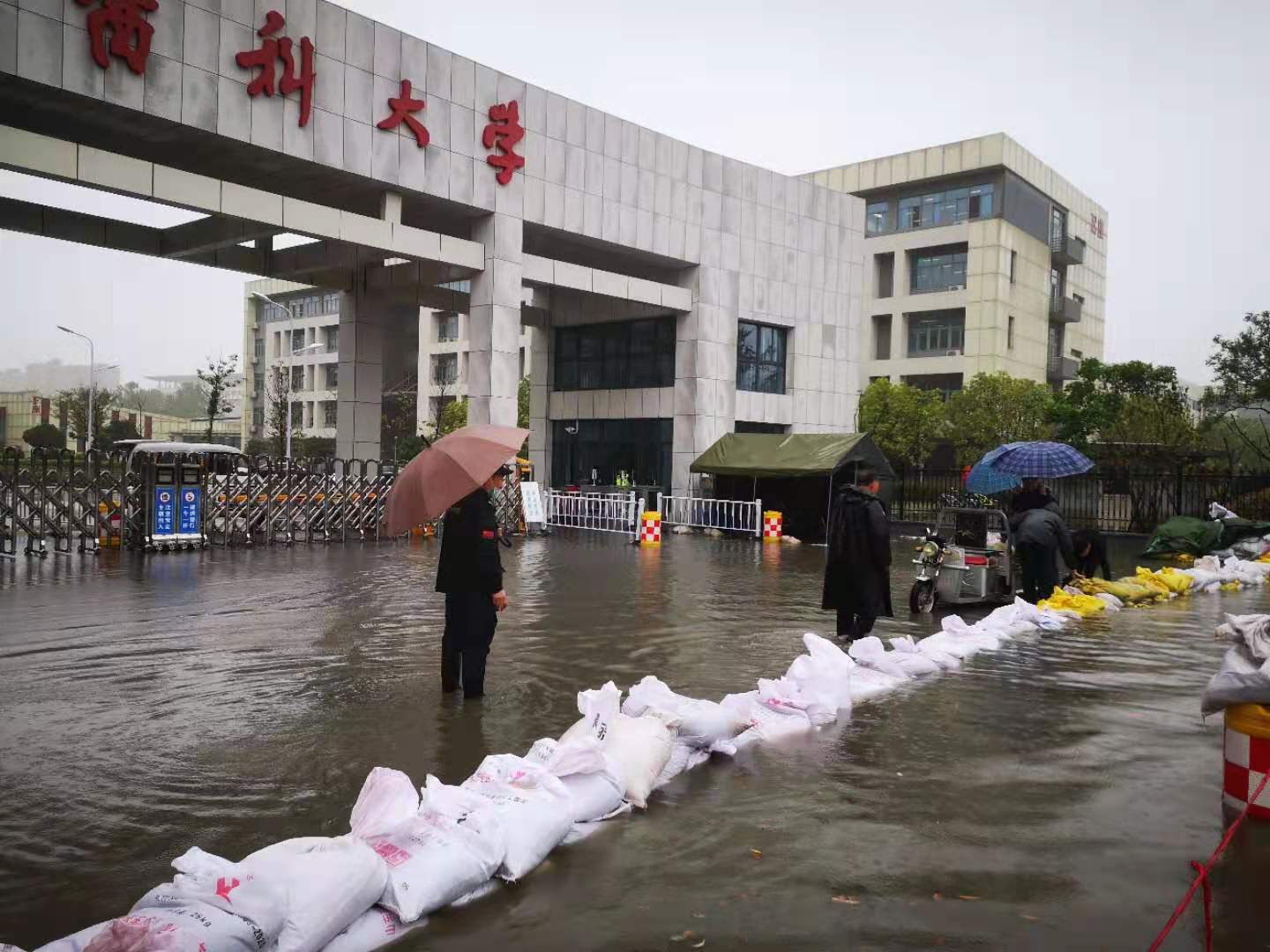 5月14日上午7:30分,连降一夜的暴雨一直未停,校外云苑路雨水倒灌至捕鱼达人 东大门区域,出现汛情。后勤管理处立即启动抗洪抢险工作,后勤管理处处领导、科级干部和业务中心主任8:00之前全部赶到捕鱼达人 ,参与抗洪抢险。后勤管理处维修管理科采取强排措施抽取学生宿舍13、14号楼架空层积水,在学生宿舍11、12号楼搭设浮桥,以便于学生通行。能源管理科积极联系云龙区农水局开放三道中河闸门,以利于捕鱼达人 雨水排出。上午8:30分,校领导夏有兵、张玉勤到捕鱼达人 东大门积水区域走访调研并召开现场办公会,指导后勤管理处抗洪抢险。中午,后勤管理处组织工作人员把沙袋摆放在东大门门口,以防校外雨水倒灌至捕鱼达人 。傍晚,后勤管理处基建科组织人员奋战一夜,彻底疏通东大门区域排水管道。