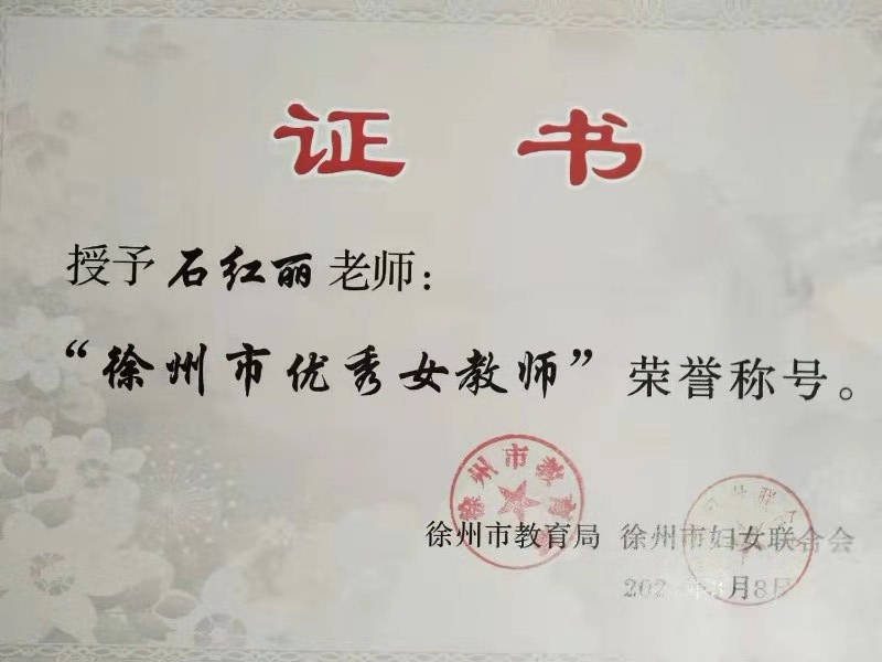 近日,徐州市教育局、徐州市妇女联合会联合发文,表彰全市优秀女教师,捕鱼达人 石红丽老师被授予“徐州市优秀女教师”称号。
