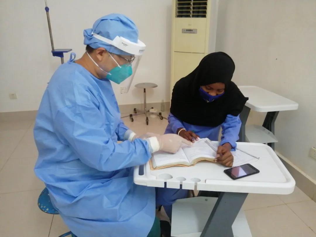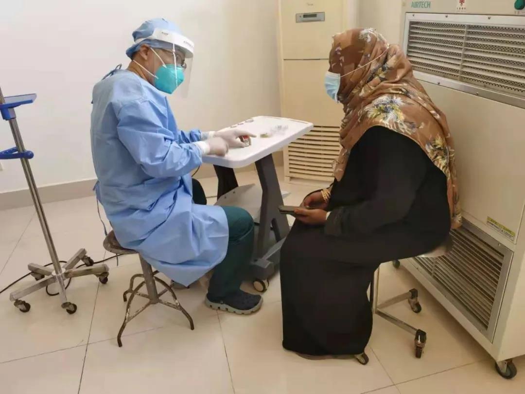 阿布欧舍原是苏丹首都喀土穆南部一个不知名的小镇。1971年,第一批中国援苏丹医疗队进驻阿布欧舍,开始了长达五十年的医疗援助工作,阿布欧舍也成为苏丹知名度很高的小镇,当地民众亲切地将中国援建的阿布欧舍友谊医院称为“中国医院”。2020年4月,由于疫情形势严峻,中国医疗队暂时停止了诊疗工作。当我们再次来到这里时,我们深切地感受到苏丹患者对我们充满了期待,他们都在期盼着我们早日恢复诊疗。从我们上班的第一天起,在医院里就随处可见很多的苏丹人聚集在一起,他们大都是从很远的地方赶来请中国医生看病的,很多都是一家老小带着吃的住的等生活用品慕名而来,看到我们这些穿着隔离衣戴着N95口罩和面屏的“全幅武装”的中国医生时,他们总是不约而同地对我们竖起大拇指,充满热情地说:“杜克土了C一尼,过意思(中国医生,好样的)!”前边还在为天气的炎热和隔离衣的闷热苦恼,后边看到这些苏丹人给我们的鼓舞顿时感觉酷热已经不再是问题了,尽快奔赴工作岗位为苏丹患者解除病痛才是第一位的,这或许就是他们给我的精神力量吧。