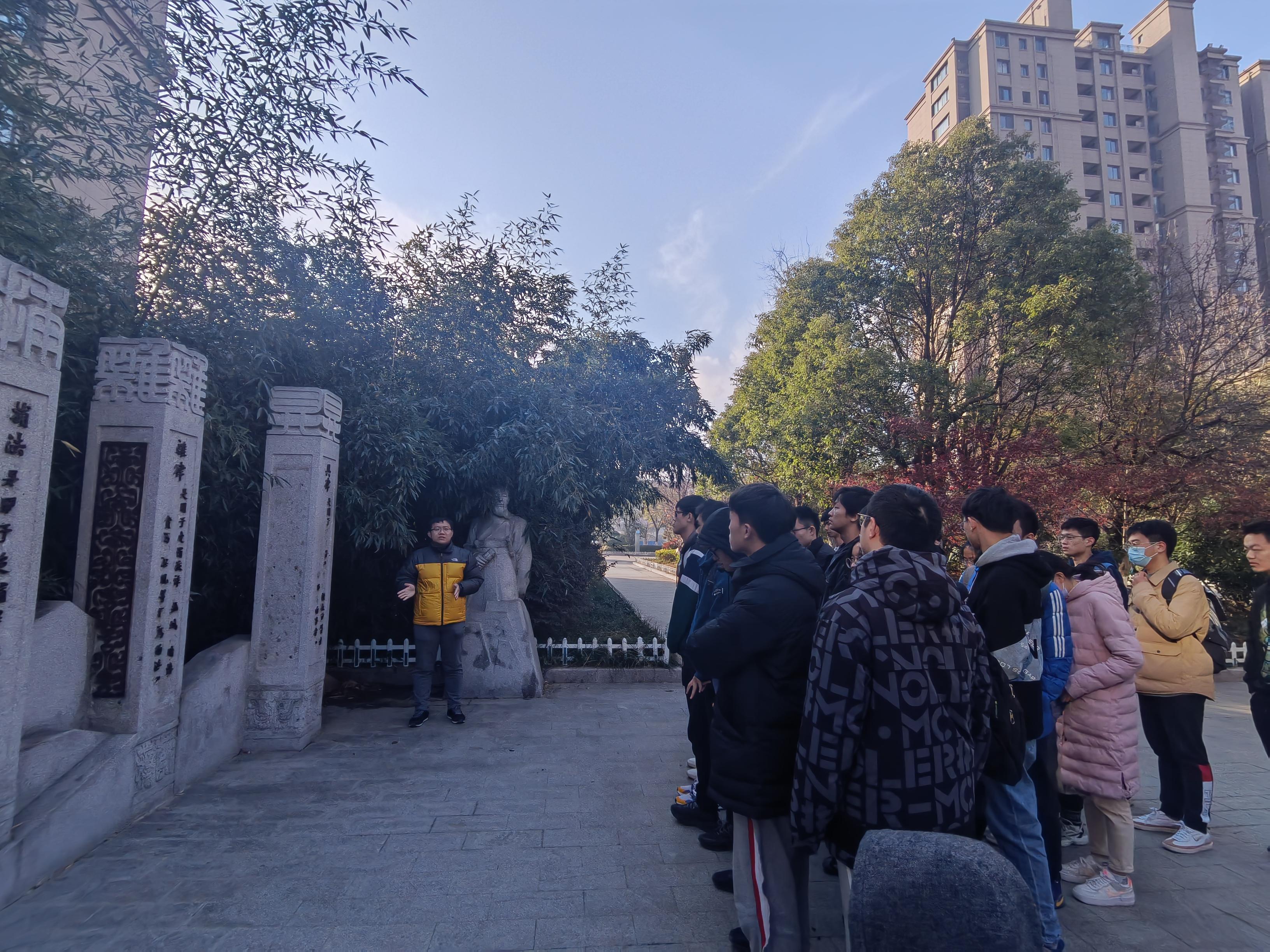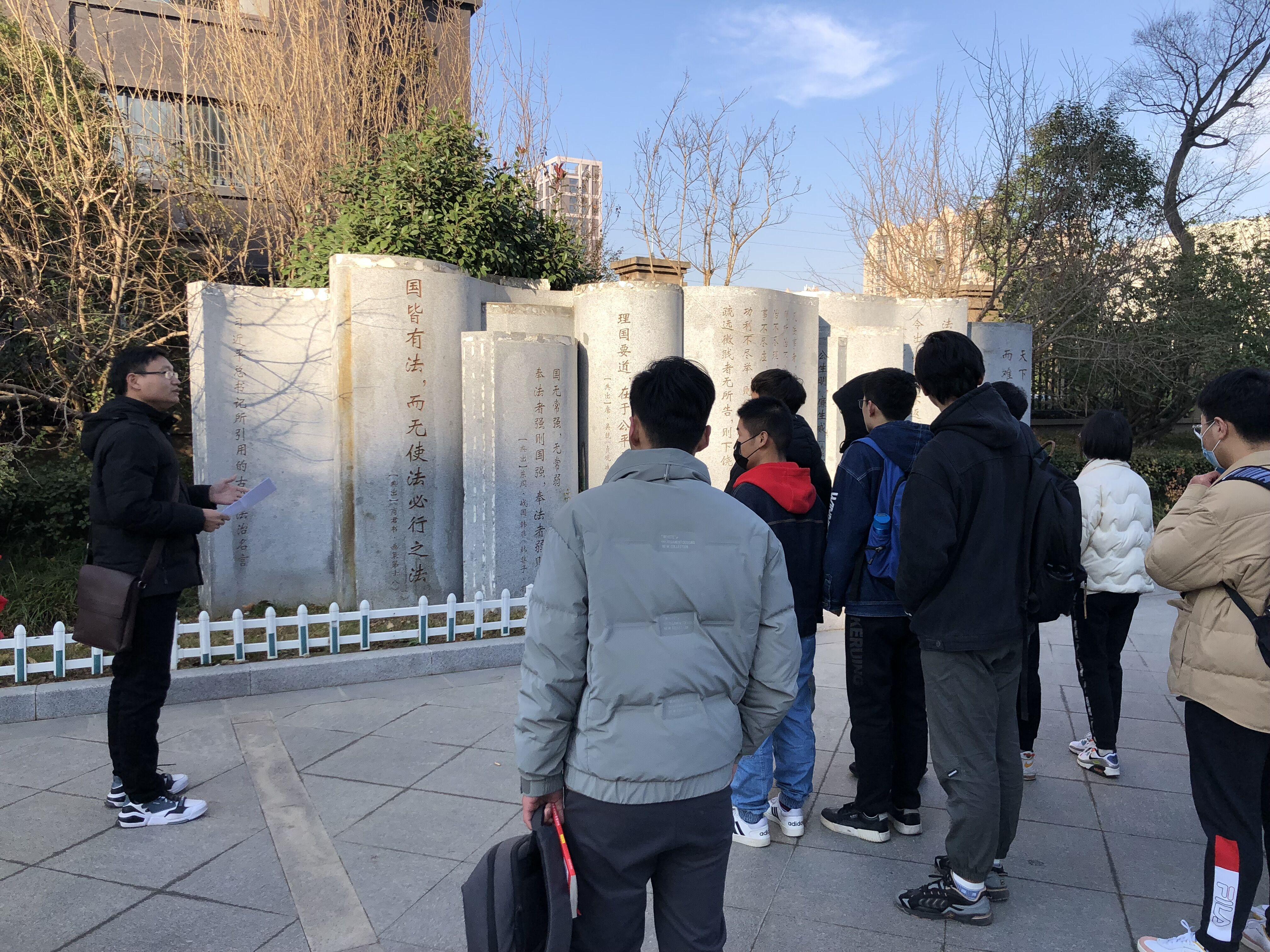 在“习近平总书记所引用的古代法治名言”石雕群前,谭春波老师结合《习近平用典》中的相关解读,对每块石雕上习近平总书记所引用的法治名言的原文出处、历史背景和现实意义进行了详细解读。