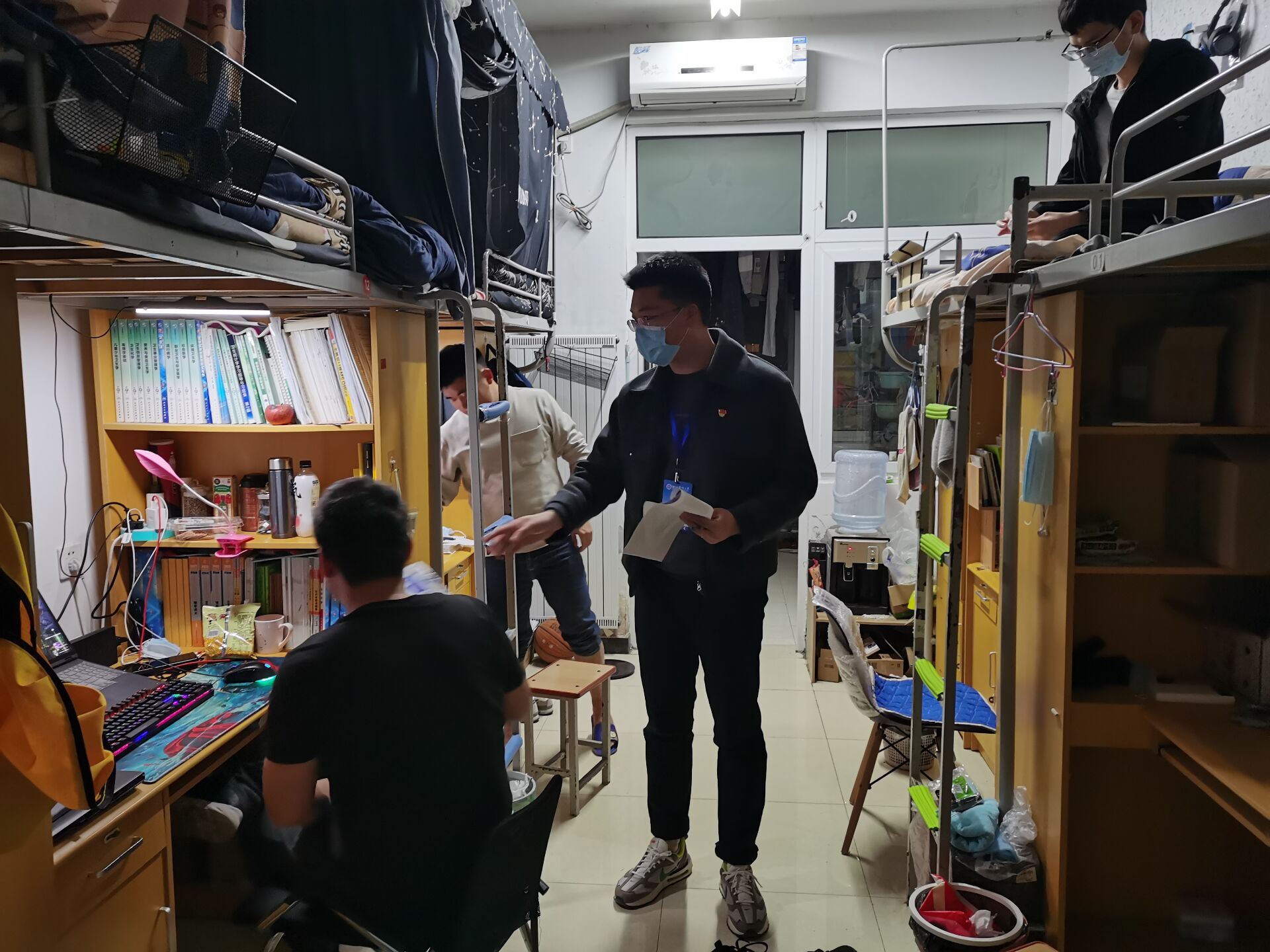 辅导员吕鑫老师主动申请住校,投身战“疫”一线,用心、用情、用力守护每一位学生的身心健康。全面摸排情况、走访学生宿舍、督促每日健康打卡、发布核酸检测通知、维护现场秩序,是他每天的生活日常。他始终与学生们在一起,“若有需,我必应”是他对每一位学生的承诺。