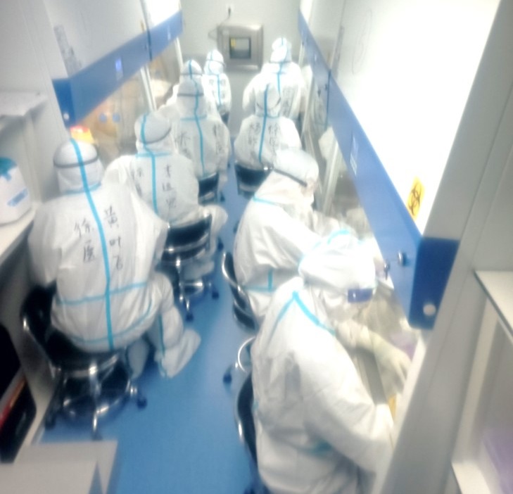 经过了严格的线上理论培训和实践操作技能培训,老师们熟练掌握了核酸检测的基本知识和技能,黄叶飞老师主要负责核酸提取,其余老师均负责加样,分工明确,各司其职,基本每天都是坚持数小时,奋战在狭小的检测方舱中。