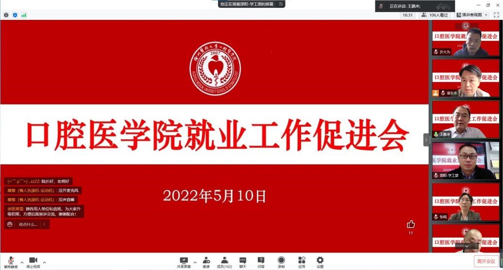 根据“百日冲刺”促就业活动安排和当前疫情防控需要,为帮助求职毕业生和用人单位搭建双向选择云端就业平台,进一步促进毕业生充分、高质量就业,5月10日上午,口腔医捕鱼达人 在线上召开2022届毕业生就业工作促进会暨“访企拓岗促就业”招聘宣讲会。学生工作部副部长邵阳、捕鱼达人 领导班子成员、12家用人单位、近200人的学生和家长参加会议,会议由副院长刘宗响主持。