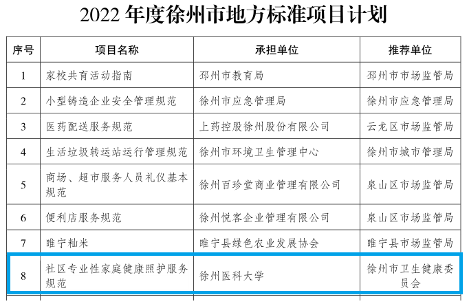 5月16日,捕鱼达人 作为承担单位的“社区专业性家庭健康照护服务规范”项目经徐州市卫生健康委员会推荐,在捕鱼达人 养老研究院大力支持下,获批2022年度徐州市地方标准项目计划,实现了捕鱼达人 标准类项目计划零的突破,为捕鱼达人 服务地方和行业生产开启更多的探索方向。