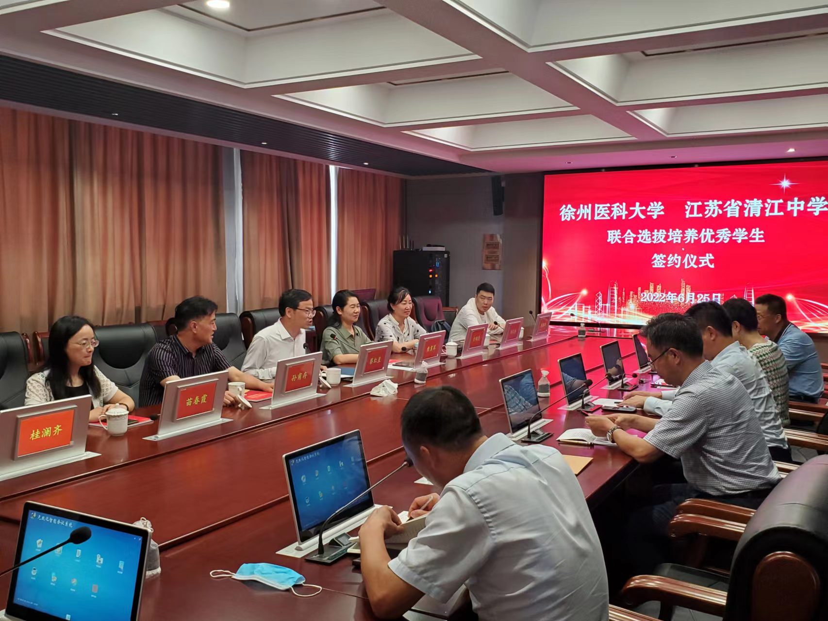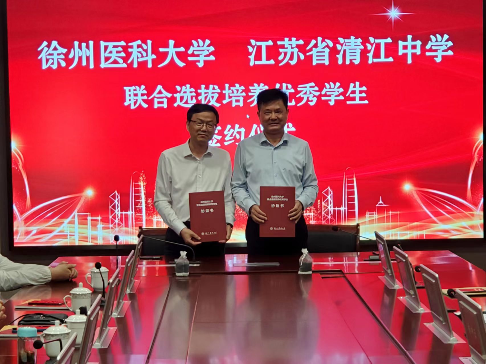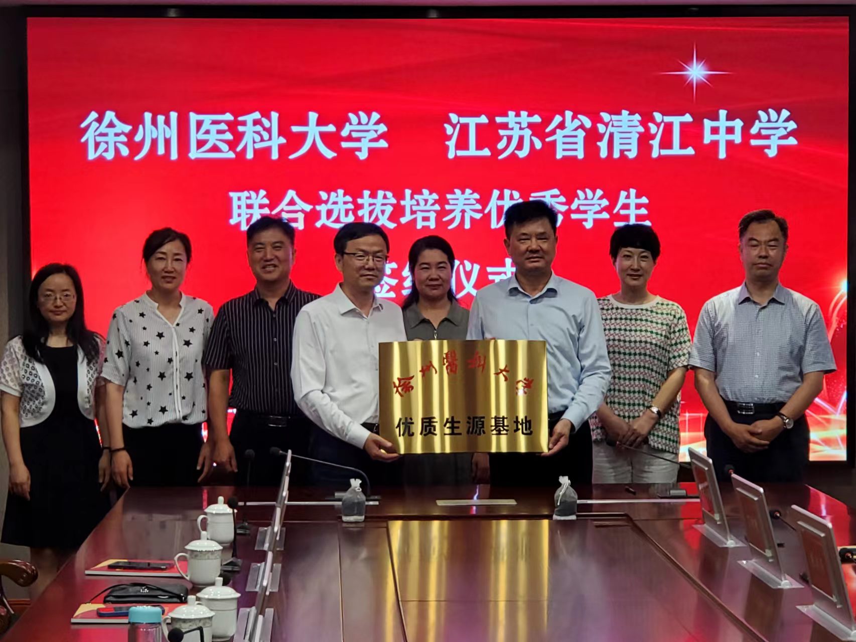 江苏省清江中捕鱼达人 长陈欣、副校长乔中云、副校长王耀松等领导出席了会议,双方秉持推进人才培养质量的原则,对优质生源基地共建工作的开展进行了全面讨论,最终达成了共识,通过长期的不间断的全方位合作,实现合作共赢,共同推进优质人才的培养。随后,蔡红星和陈欣代表双方单位签署了优质生源基地共建协议,并一起为优质生源基地揭牌。