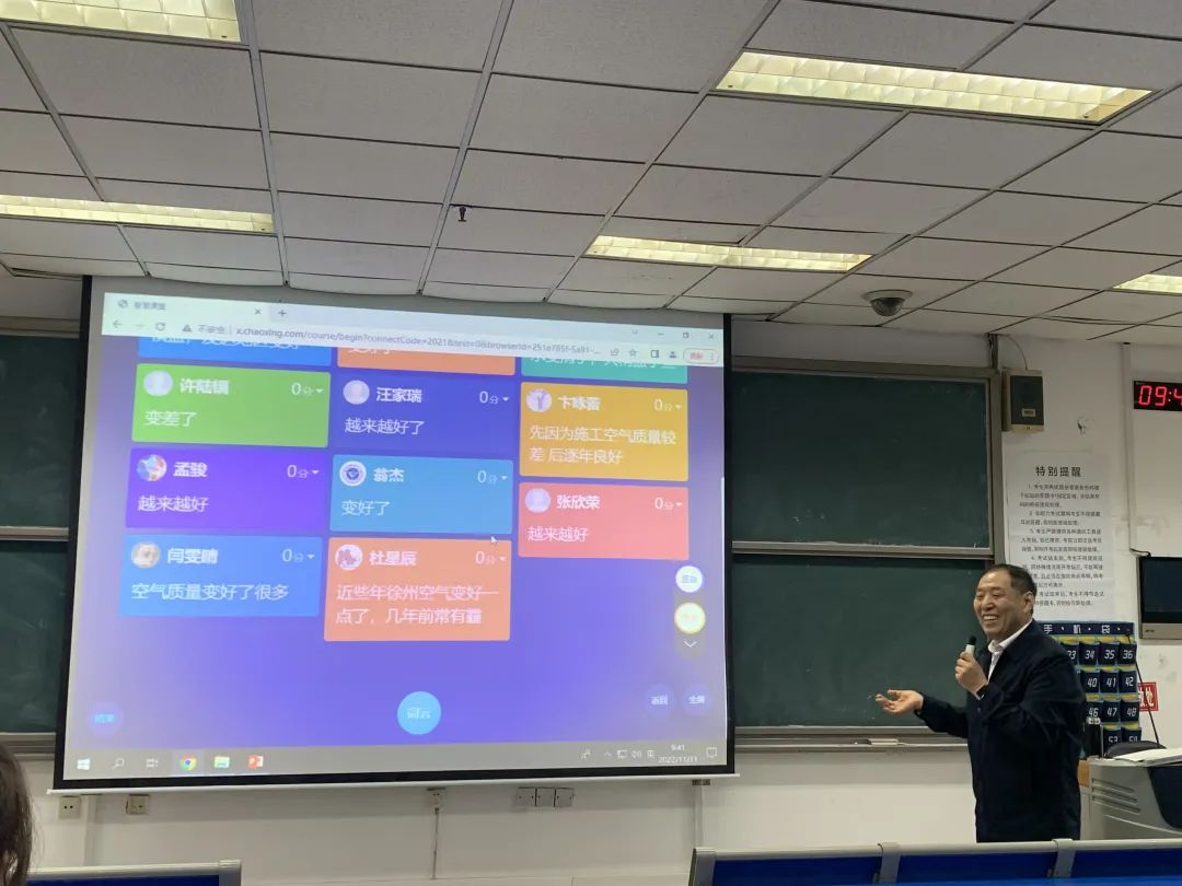 那天早上大雾,上课时仍旧蒙蒙未散。夏向东老师顺势问大家今天的天气是霾是雾,在同学们小声讨论间,他解释了二者的区别,于是很自然地在学习通上发起了讨论:“和前几年相比,你觉得天气是变好了还是变差了?”很快,大屏上彩色方块跳动,同学们各抒己见,课堂氛围活跃起来,学生的注意力也被聚拢进教室。不要小瞧这个问题,作为课堂导入,它呼应当天时事,让学生有参与感,且非常自然地引出了今天课程主题“社会主义生态文明”并贯穿课堂始终。可以说一个巧妙的导入是教学设计的灵魂所在。