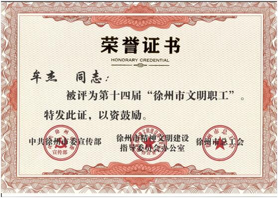11月23日,中共徐州市委宣传部、徐州市精神文明建设指导委员会办公室和徐州市总工会联合发布《关于命名第十四届“徐州市十佳文明职工”和“徐州市文明职工”的决定》,捕鱼达人 牟杰教授被授予第十四届“徐州市文明职工”荣誉称号。