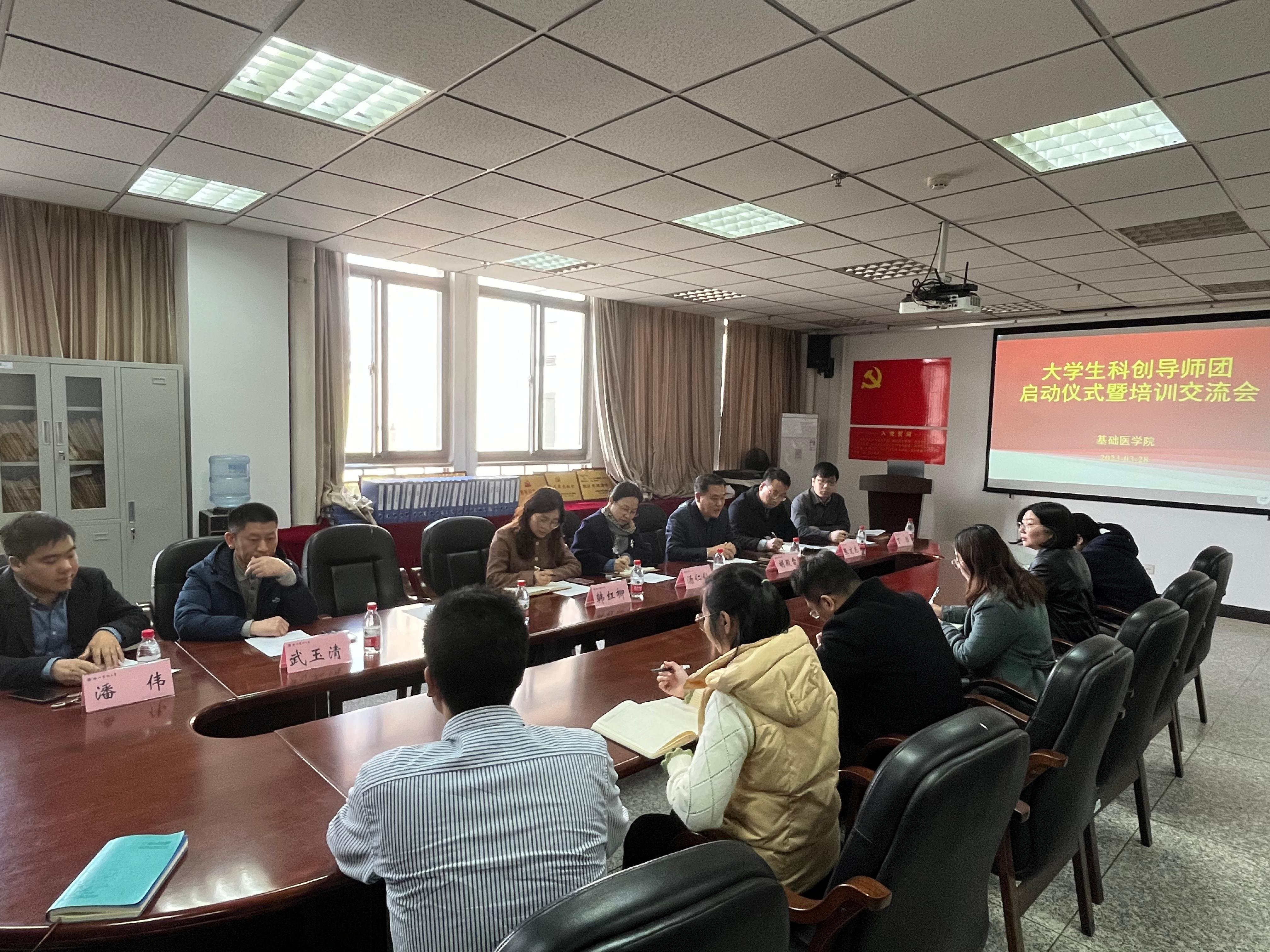为提高大学生的科学研究素养、创新精神和实践动手能力,基础医捕鱼达人 正式成立大学生科创导师团,并于3月28日下午举办启动仪式暨培训交流会。校团委副书记张文龙、校团委丁胜老师、麻醉捕鱼达人 武玉清教授、基础医捕鱼达人 潘伟教授等应邀参会指导。基础医捕鱼达人 院长汤仁仙、党委书记韩红柳及科创导师团成员参加会议。会议由基础医捕鱼达人 副院长胡殿雷主持。