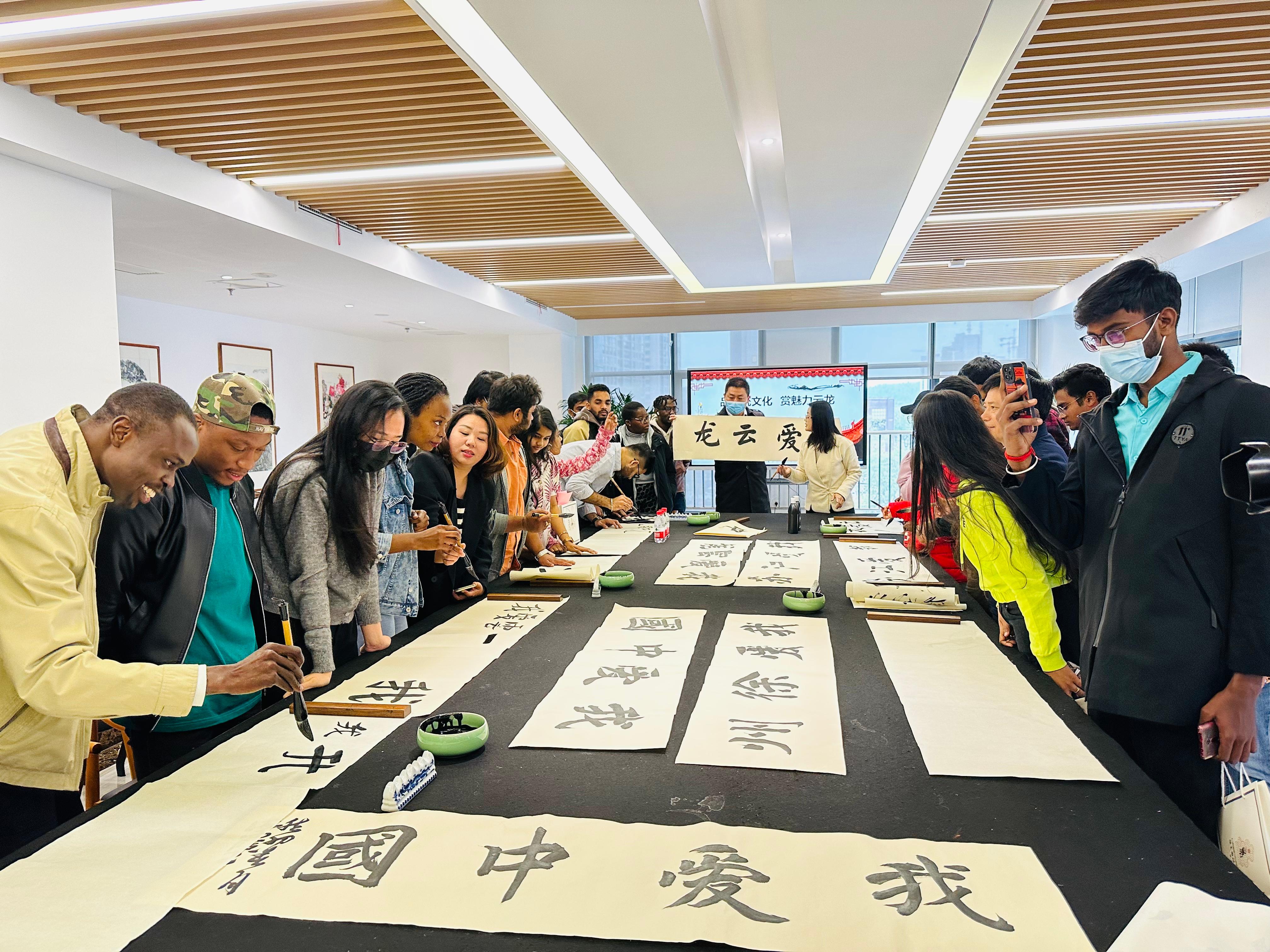 在云龙区文化馆,贺恒松欢迎留学生们来到中国徐州,希望他们积极学习中国优秀传统文化,做中外友好、人文交流的民间使者。云龙区书法家协会会长张海霞指导留学生通过正确的执笔方法、书写姿势,书写不同字体的书法作品。留学生们被强烈吸引,在宣纸上书写下了“我爱中国”“我爱徐州”“我爱云龙”“我爱徐医”。