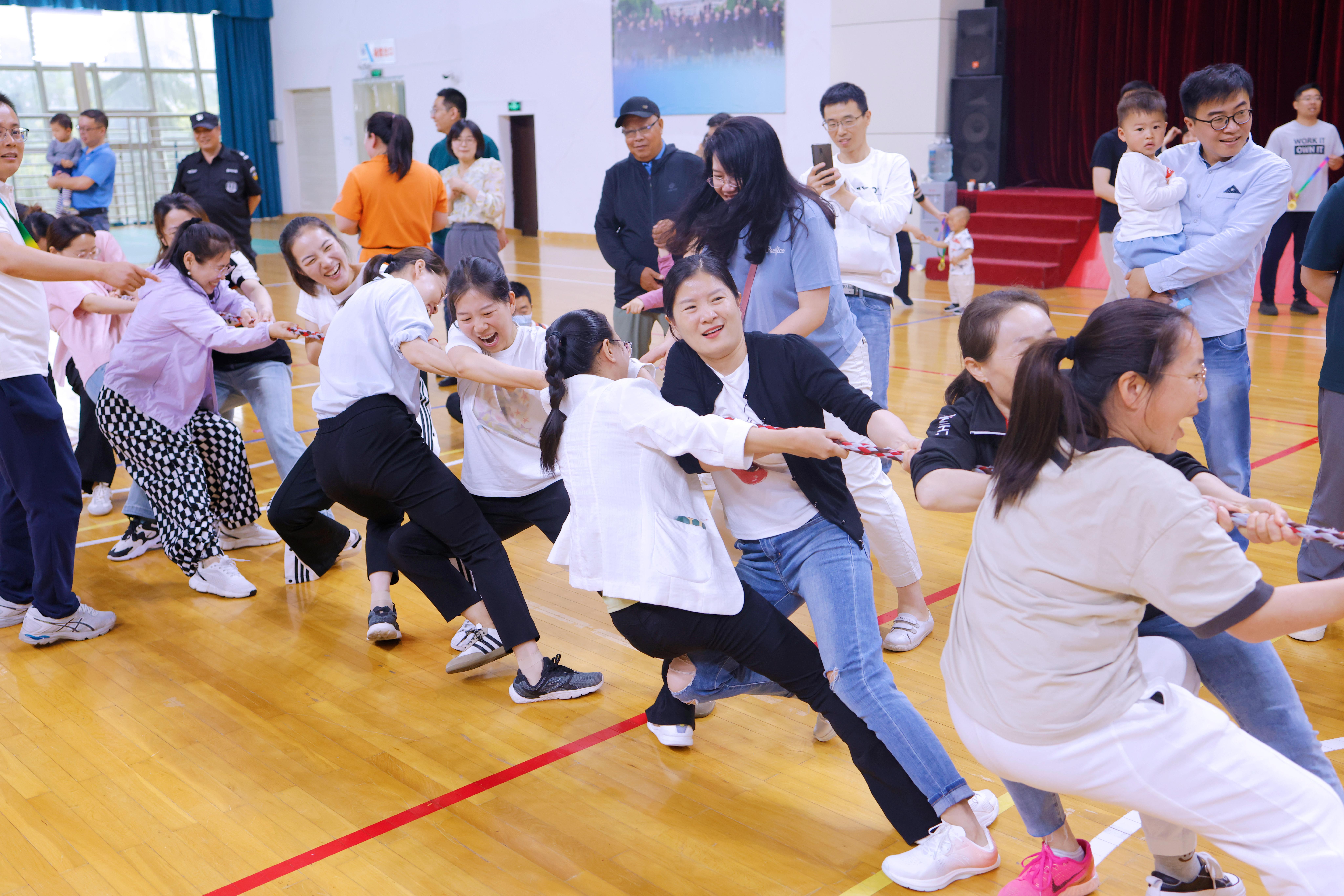 本届亲子运动会以“亲子运动,动力无限”为主题,按照不同的年龄段分为五个参赛组,活动精心设计了“划小船”“诺亚方舟”“袋鼠跳”“小熊赛跑”“坦克游戏”“拍球走”等比赛项目,还设计了“宝爸拔河”“宝妈跳绳”等家长趣味项目。教职工家长们和小朋友们齐上阵,亲子合力,各展所能。家长们在游戏中重温了久违的童趣,欢快地和孩子们玩耍在一起,享受到了珍贵而美好的亲子时光。