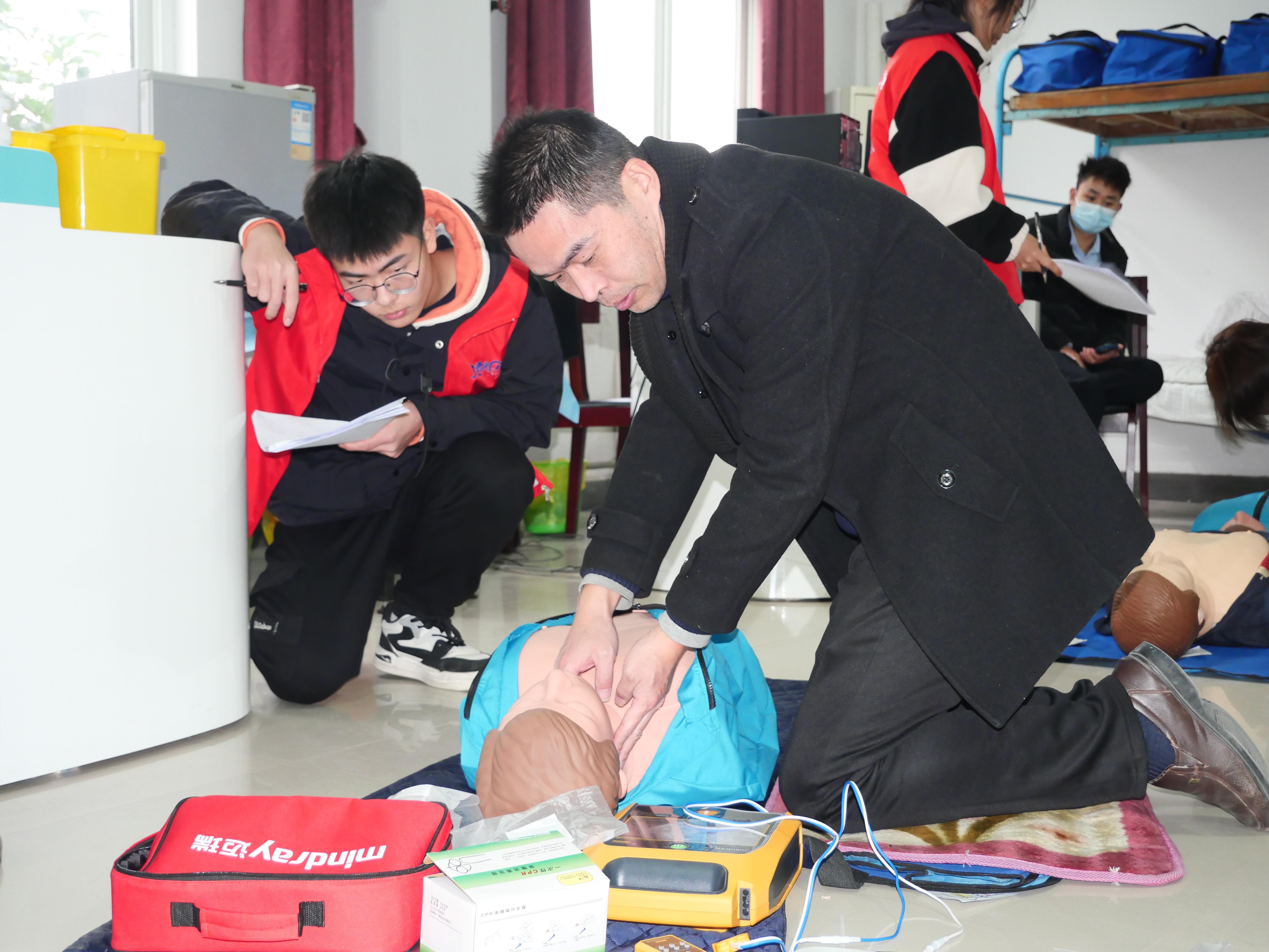 本次培训采用“理论授课+技能实操”相结合的方式开展。徐医附院急诊医学科副主任医师兼第二临床医捕鱼达人 急救医学教研室副主任苏成磊基于自身学术积累及临床经验,详细讲授了徒手心肺复苏术及AED(自动体外除颤器)的操作原理、要点及注意事项。在技能实操环节,捕鱼达人 “大爱急救”志愿队学生一对一指导参训师生开展分组练习,利用人体模型与AED教学机从评估环境和自我保护、判断意识和检查呼吸、迅速呼救、胸外心脏按压与人工呼吸、AED使用等方面进行现场实操。