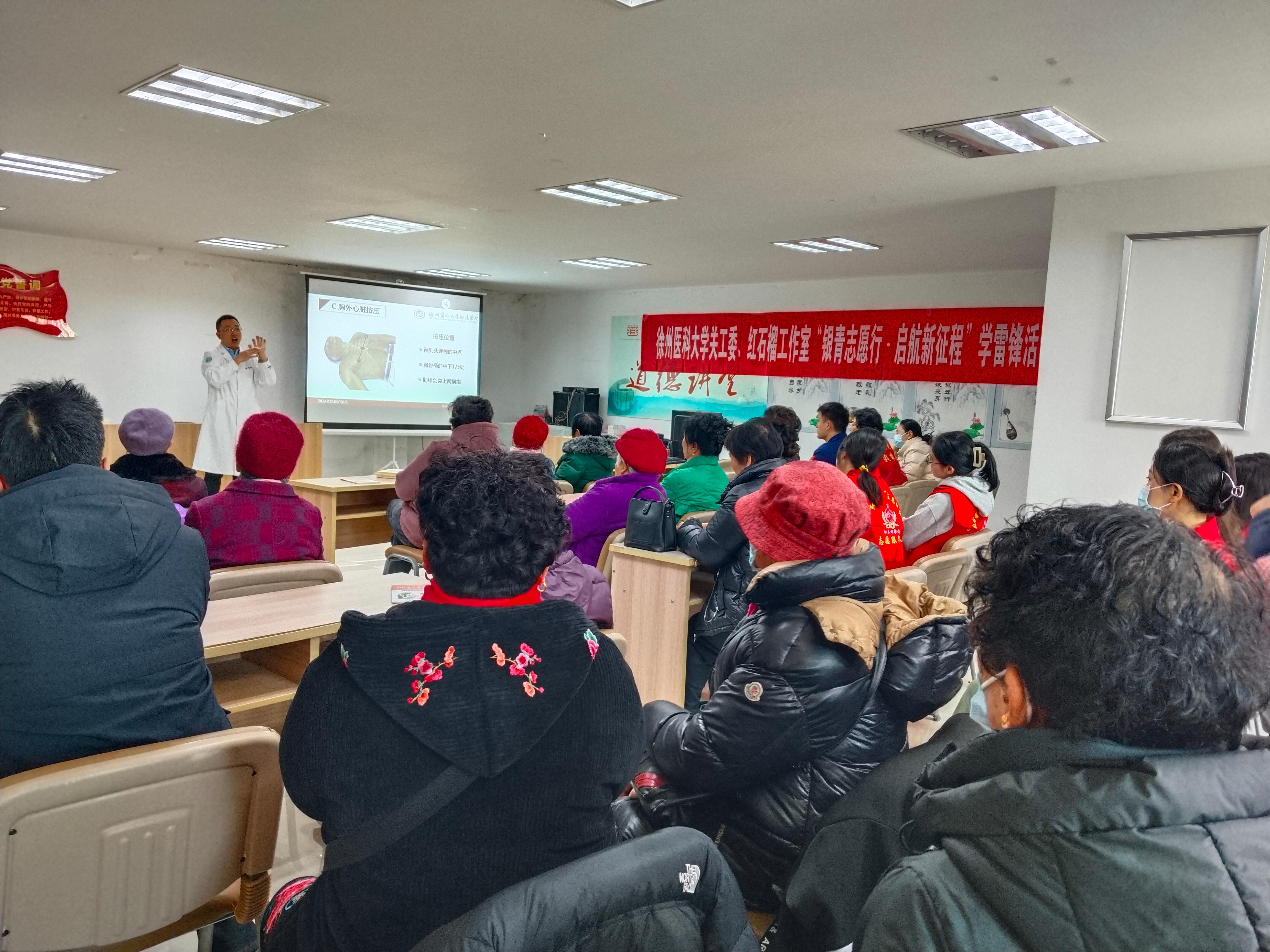 徐医附院急诊医学科专家、江苏省急诊急救专科护士导师赵明阶开展了“紧急救护技术”专题讲座,通过通俗易懂的理论知识讲授、生动丰富的PPT演示以及仿真现场技巧演示等,为在座的居民讲解心肺复苏、创伤救护等基本技能。随后,专家和学生志愿者在现场向居民们示范胸外心脏按压、救命神器AED的使用、海姆立克急救法等突发紧急情况时快速有效的科学施救办法。大家热情高涨,边听边学,专家和志愿者耐心讲解、手把手教授。