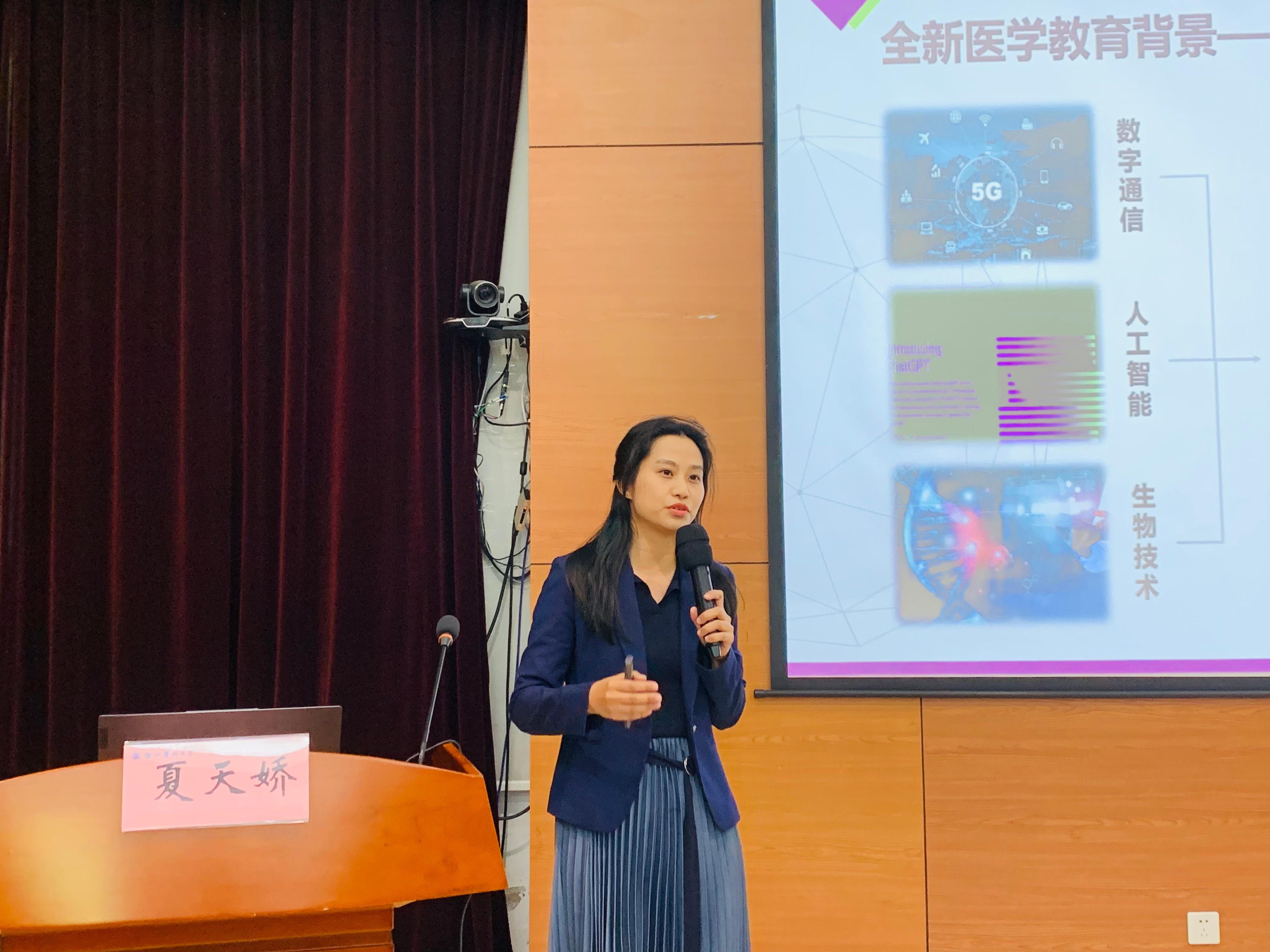 夏天娇以“新医科背景下,如何运用新思维进行医学课堂教学设计”为题进行了分享,展示了青教赛国赛一等奖获得者的风采。她从新医科背景出发,探讨了如何运用创新思维优化医学课堂教学设计,提高教学质量和学生的学习效果。
