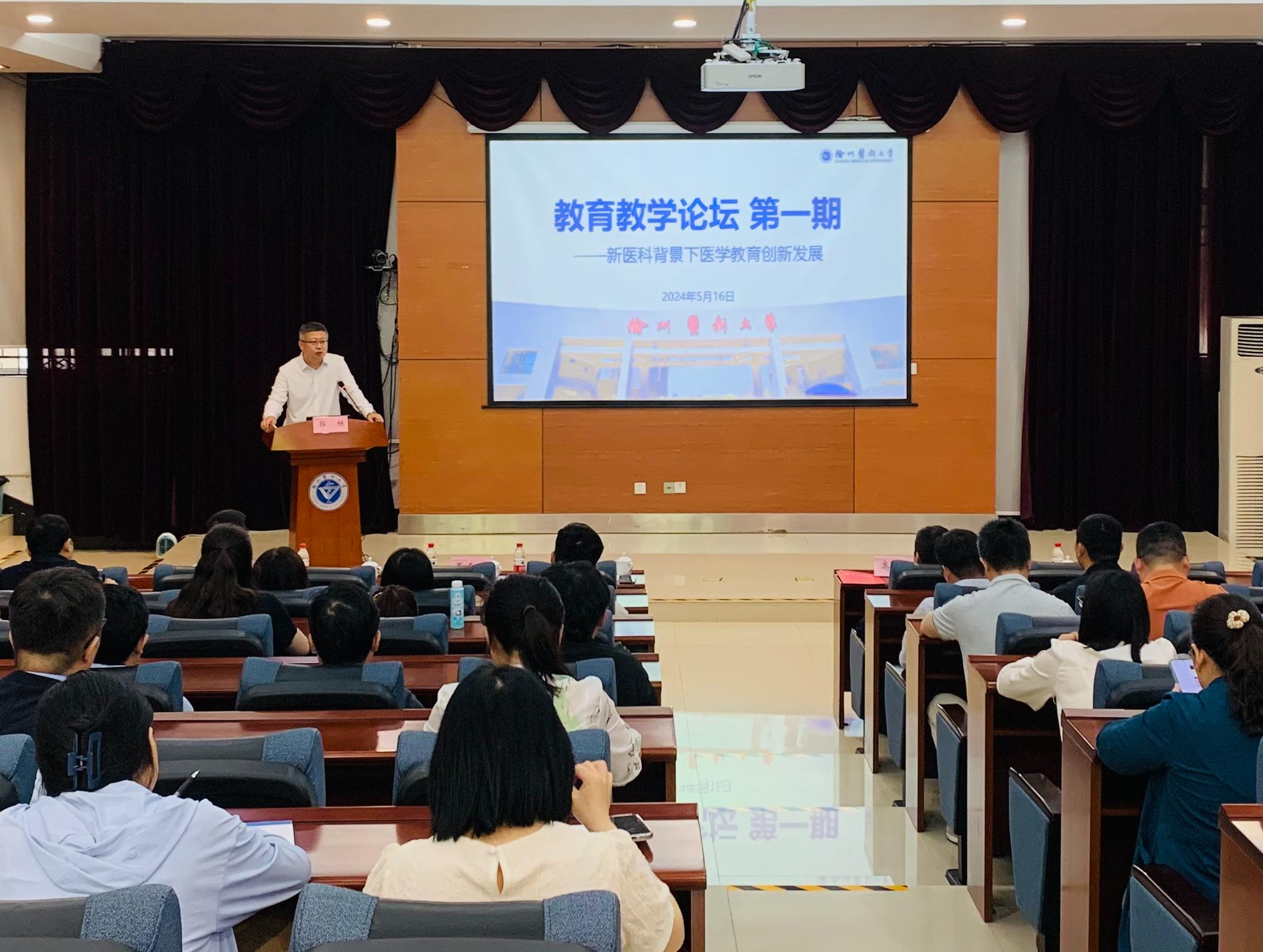 5月16日上午,捕鱼达人 首期教育教学论坛在行政楼101会议室举办。江苏省教育厅高等教育处二级调研员郭新宇、南京医科大学高兴亚教授、南京大学医捕鱼达人 夏天娇副教授等教育教学专家,围绕论坛主题“新医科背景下医学教育创新发展”分享了精彩报告。校党委常委、副校长郭栋出席活动并讲话,各捕鱼达人 教学负责人、教学管理人员及骨干教师等80余人参加活动。活动由教务处副处长赵子明主持。