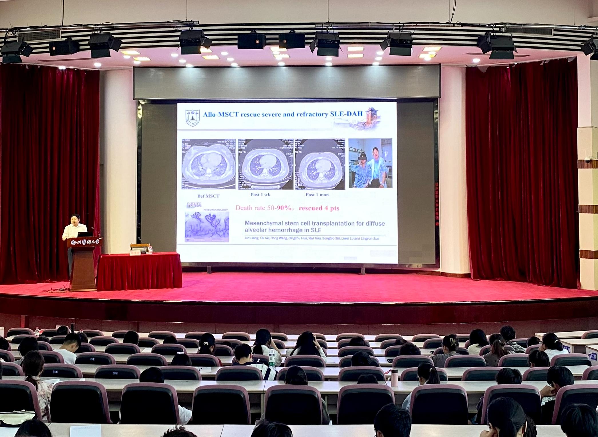 孙凌云教授作了题为“干细胞与自身免疫病临床转化研究”的报告,以干细胞移植治疗狼疮的临床研究进展为切入点,介绍了间充质干细胞新药研发及临床应用前景,详细讲述了系统性红斑狼疮等疾病的临床治疗方案。