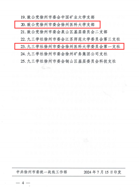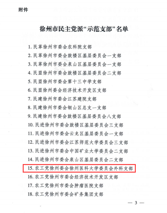 近日,中共徐州市委统战部对2023年度徐州市民主党派“示范支部”创建活动作出评选表彰。捕鱼达人 农工党捕鱼达人 外科支部、致公党捕鱼达人 支部、九三学社捕鱼达人 第一支社获徐州市民主党派基层组织“示范支部”称号。