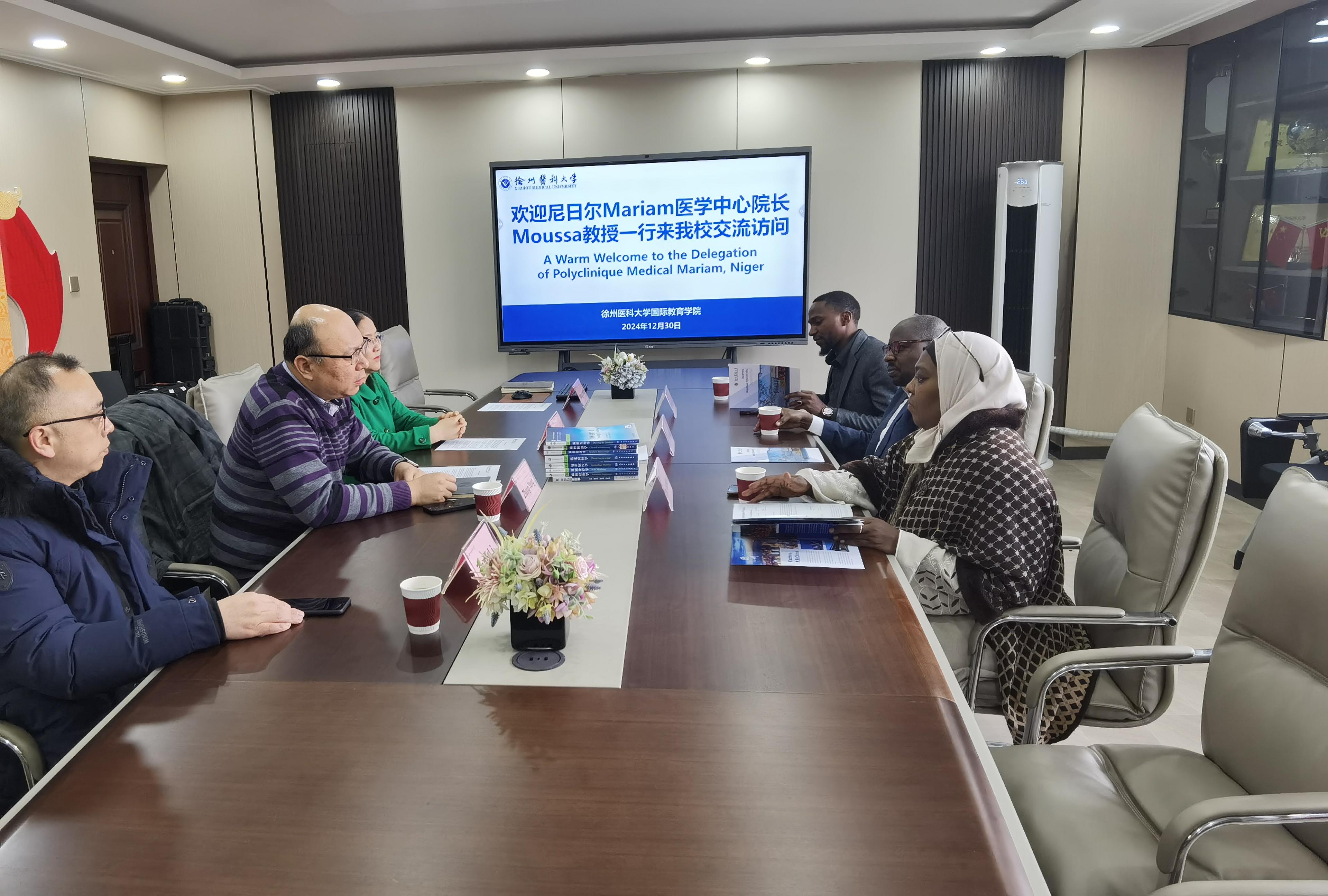 12月30日,尼日尔Mariam医学中心院长Moussa教授一行来捕鱼达人 交流访问。国际教育捕鱼达人 院长张卓琦、副院长张洋、麻醉捕鱼达人 副院长张咏梅及国际教育捕鱼达人 部分教师参加座谈交流。会议由张洋主持。