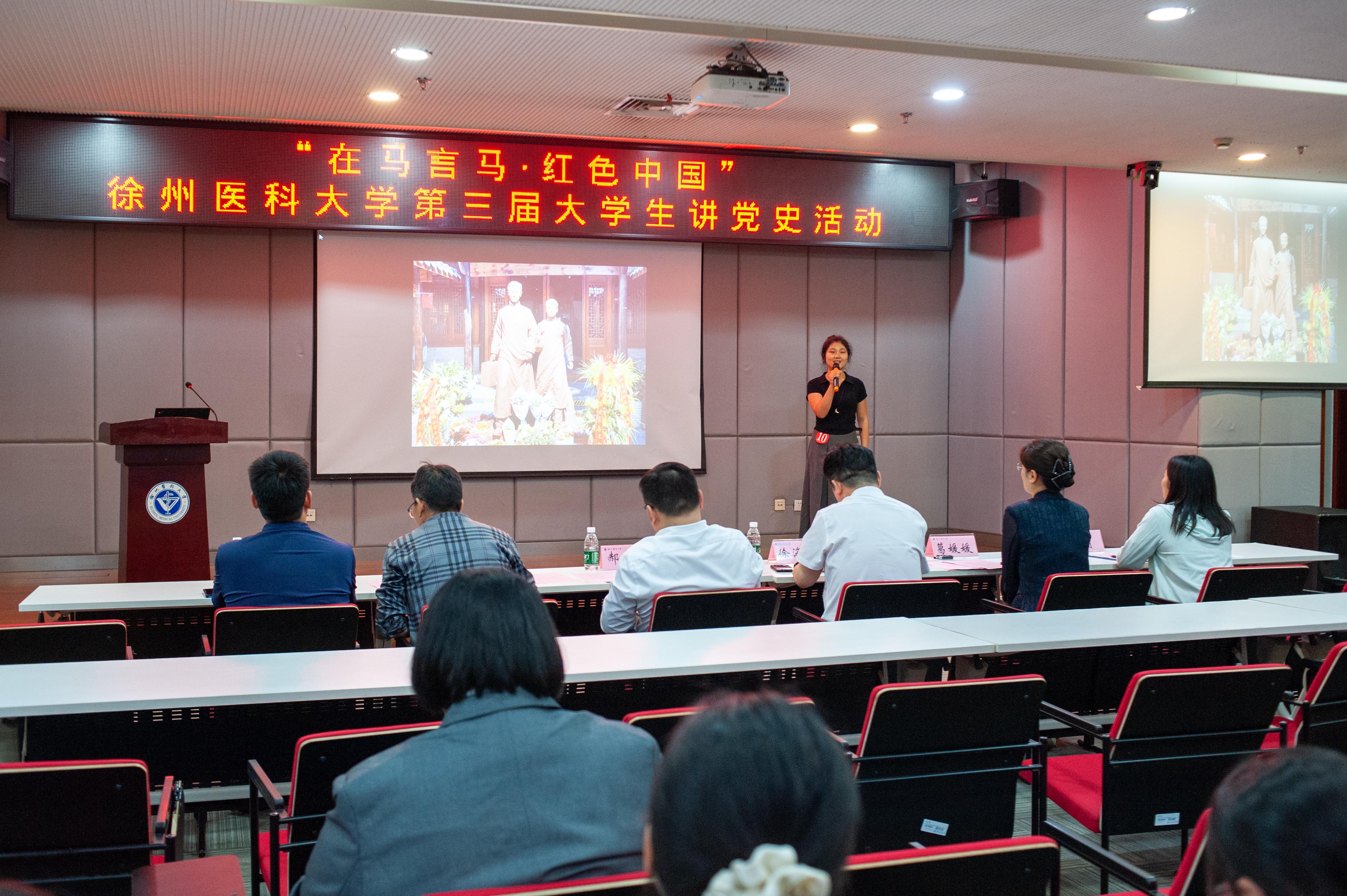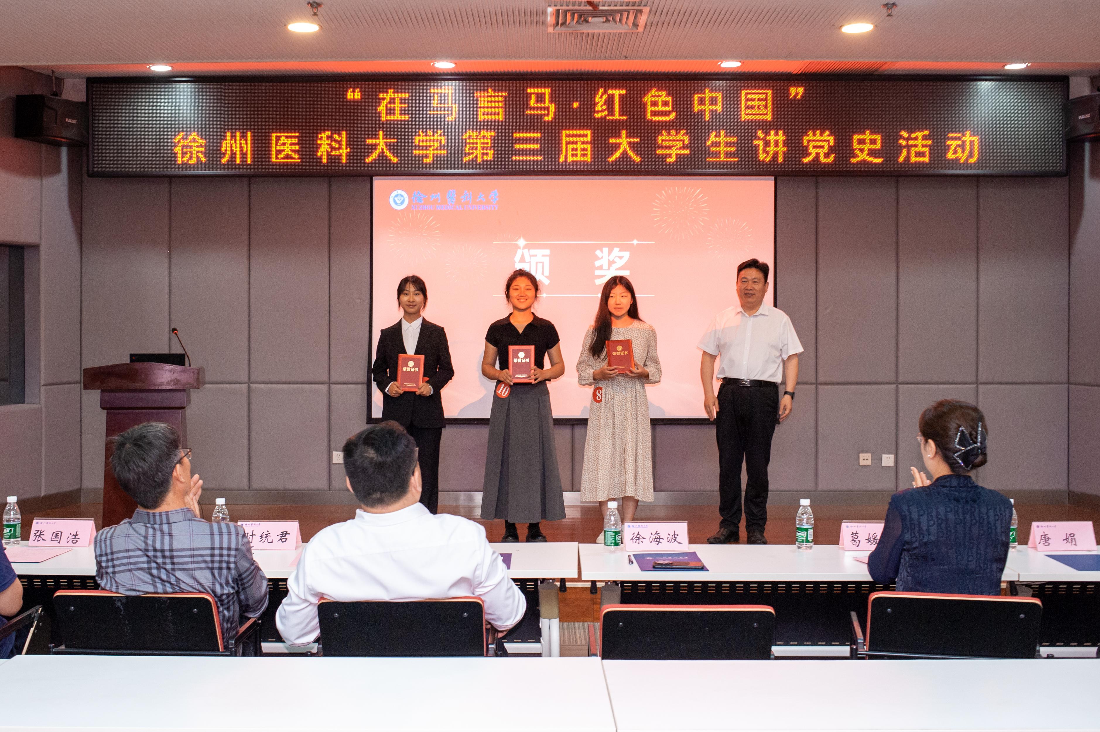 习近平总书记在党的二十大报告中指出:“青年强,则国家强。”这一重要论断深刻揭示了青年发展与民族复兴的内在逻辑。“在马言马·红色中国”大学生讲党史活动为徐医学子提供了一个自我风采展示的舞台、深入学习党史的讲台、相互交流借鉴的平台,在这个平台上15名参赛选手以严密逻辑、生动语言,从不同角度、不同层面讲述党史故事,把那些被岁月尘封的英雄事迹、感人瞬间鲜活地呈现在我们面前。经过激烈的角逐,董丽丽、李微、张静萱同学获得一等奖,荣旌彤、郭一灿、江妤佳、张一凡、尹峥峥同学获得二等奖,刘彦辰、刘文蓓、马韵雯、唐艺心、冯天乐、邵薏洁、韩佳岐同学获得三等奖。