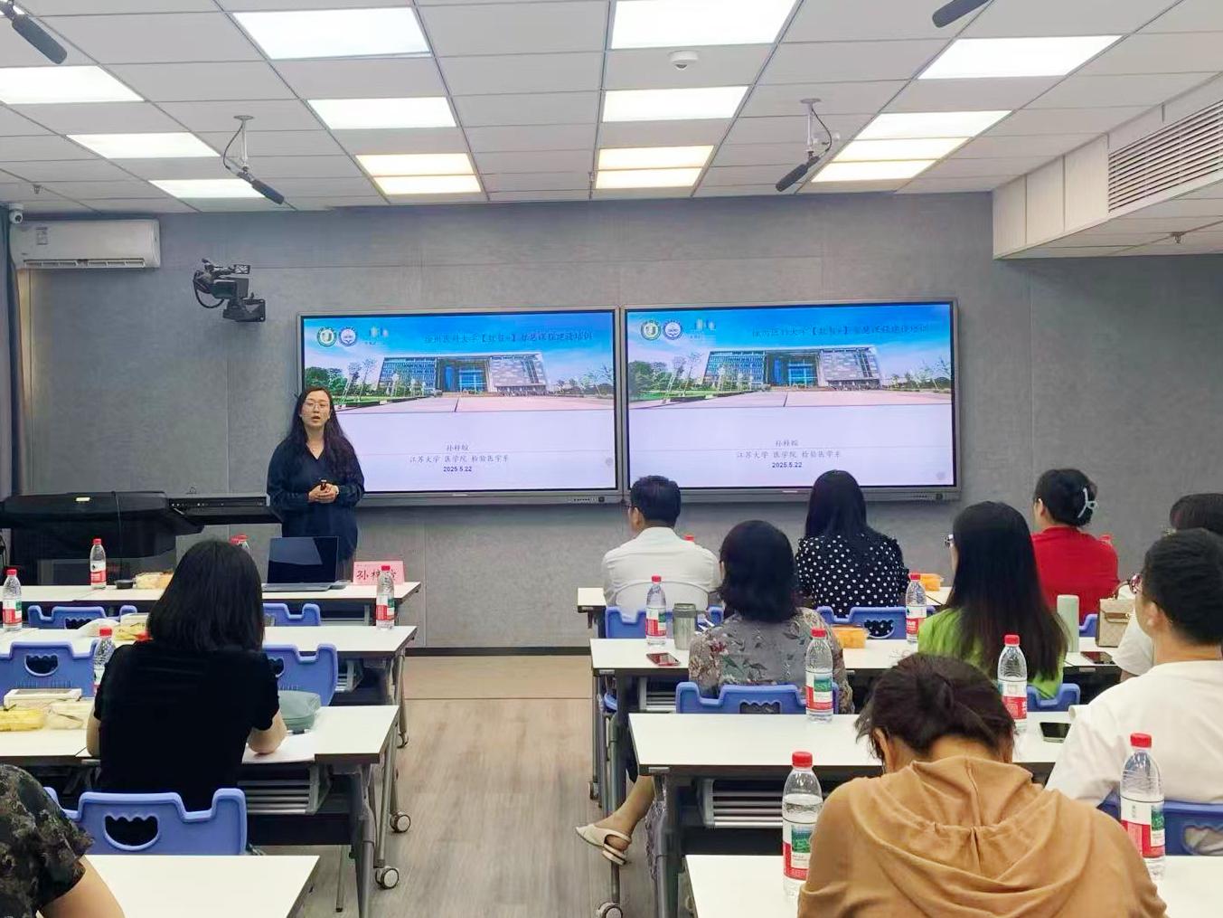 本次培训特邀北京大学初明副教授、南京航空航天大学李晋斌教授、山东第一医科大学李福荣教授、超星集团AI课程研究中心总监孙磊、江苏大学孙梓暄副教授等5位校外“AI+教育”领域的专家,围绕教育数字化转型的前沿理论与实践路径展开深度研讨。初明副教授以“基于AI的教育(AIBE)”新范式为核心,结合医学免疫学课程改革案例,深入剖析第四代医学教育改革的实践路径;孙梓暄副教授以混合式教学体系为突破口,分享了AI技术赋能课程设计、知识图谱构建等环节的创新应用,从技术赋能教育的视角,实施教学、科研、育人融合一体化,为教师们带来教学模式重构的新思路与新方法。