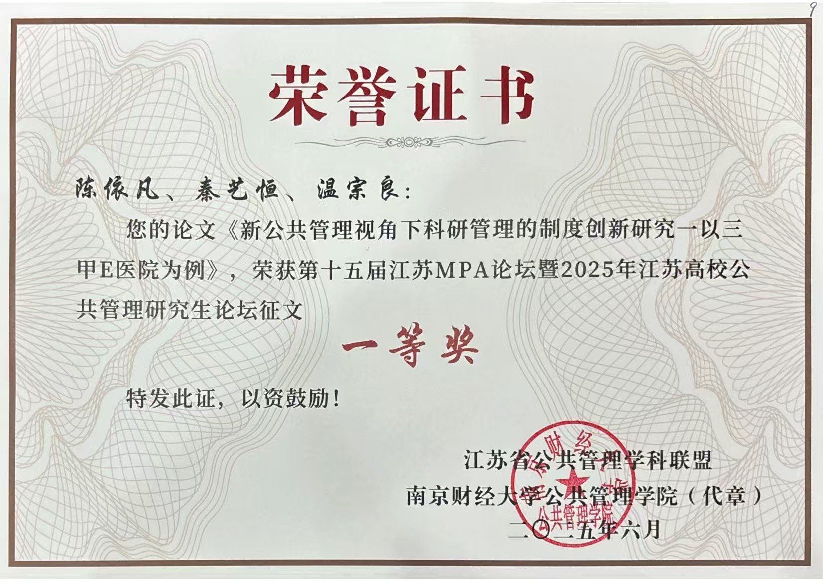 6月21日,第十五届江苏MPA论坛暨2025年江苏高校公共管理研究生论坛在南京财经大学举行。捕鱼达人 管理捕鱼达人 党总支书记方锦花、副院长温宗良、教师代表黄心如及三位MPA学员参加了此次论坛。