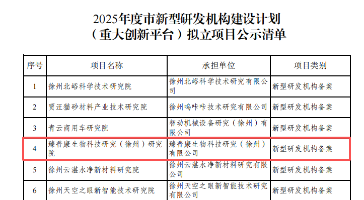 近日,捕鱼达人 科技园在孵企业臻普康生物科技研究(徐州)有限公司成功通过认定,获批2025年度徐州市新型研发机构建设计划立项。