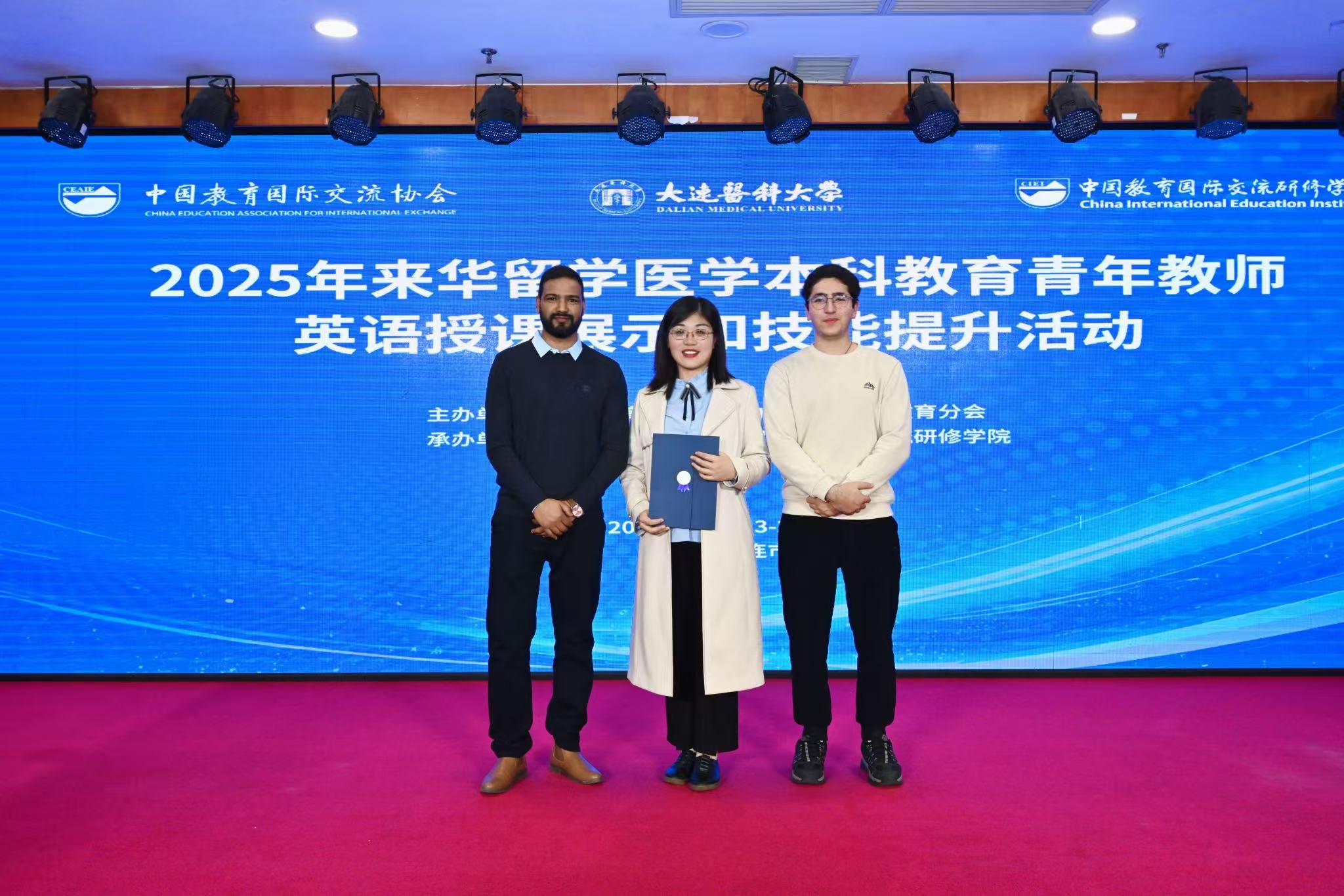 10月23至26日,由中国教育国际交流协会主办、大连医科大学与中国教育国际交流研修捕鱼达人 联合承办的“2025年来华留学医学本科教育青年教师英语授课展示和技能提升活动”在大连举行,来自全国47所高校从事来华留学英语授课医学教育的教师和管理人员共200多名代表到场观摩。国际教育捕鱼达人 院长张卓琦率队参会,捕鱼达人 生命科学捕鱼达人 于亚男老师代表捕鱼达人 参加活动,连云港市立东方医院吕艳老师及两名留学研究生教学助理AZIZI SYED MATIULLAH、SUNIL SINGH PUJARA一同参加。