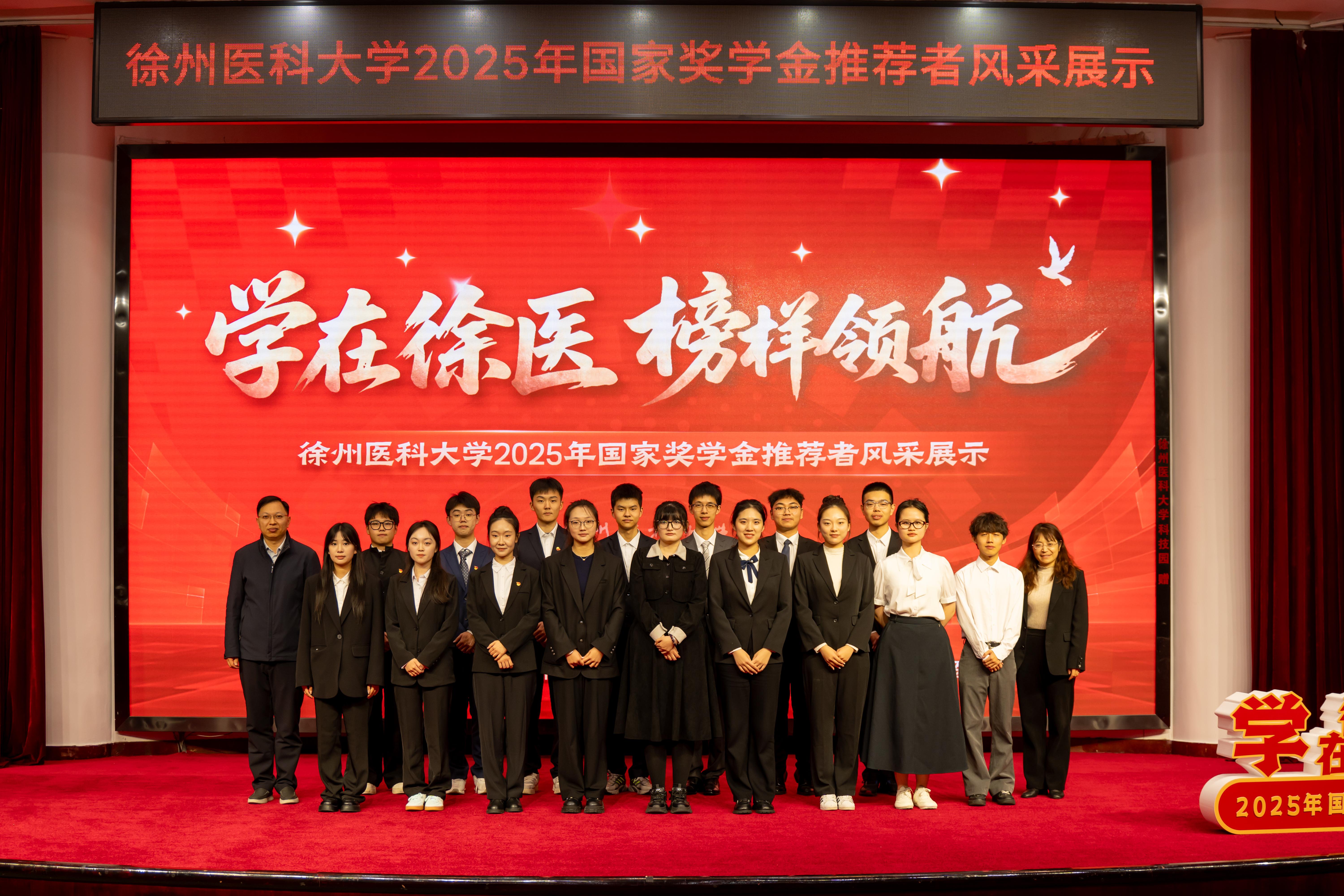 在风采展示环节,来自全校12个捕鱼达人 的17名优秀学子代表依次登台,分享了各自的奋斗历程。从课堂内的潜心钻研到实验室中的求是创新,从专业学习的名列前茅到科研竞赛的累累硕果,从志愿服务的无私奉献到临床实践的温暖坚守,他们以扎实的学业成绩、突出的创新成果和全面的综合素养,生动诠释了“以德载医、博学创新”的校训精神,充分展现了新时代徐医青年志存高远、勇于担当、奋发有为的昂扬风貌。