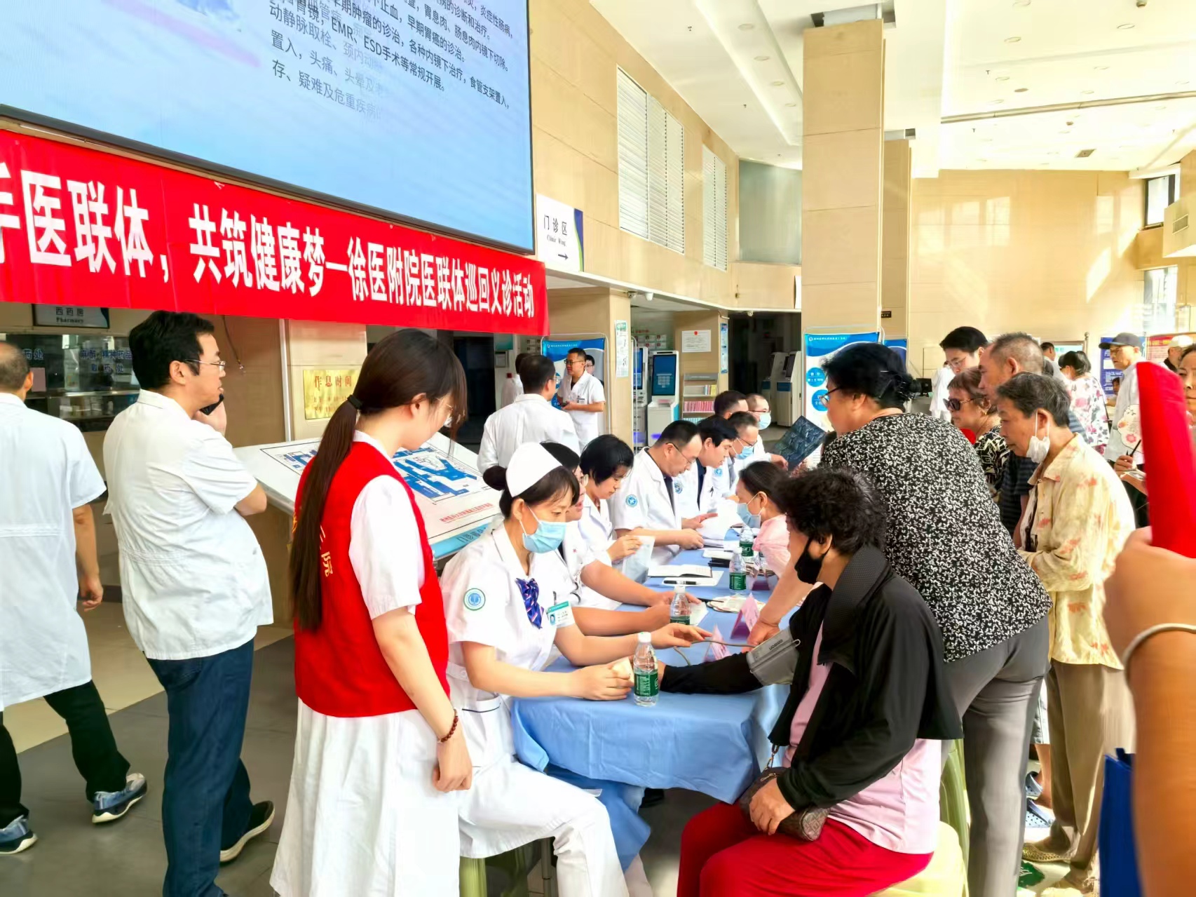活动在徐医附三院门诊大厅举行。作为医联体核心单位,徐医附院选派心内科、内分泌科、神经内科、消化内科、骨科、普外科、康复医学科等七大省级临床重点专科的专家参加活动,他们针对心血管疾病、糖尿病、骨科疾病、脑卒中后康复等区域高发、常见的健康问题,为前列就诊的患者提供精心的诊疗服务,尤其是满足了老年人群、慢性病患者“一老一慢”的健康需求。义诊专家耐心细致地为每一位居民问诊查体,为患者答疑解惑的同时,还为他们制定个性化的饮食和运动计划,让居民在徐医附三院便能享受到与徐医附院同质化的医疗服务。